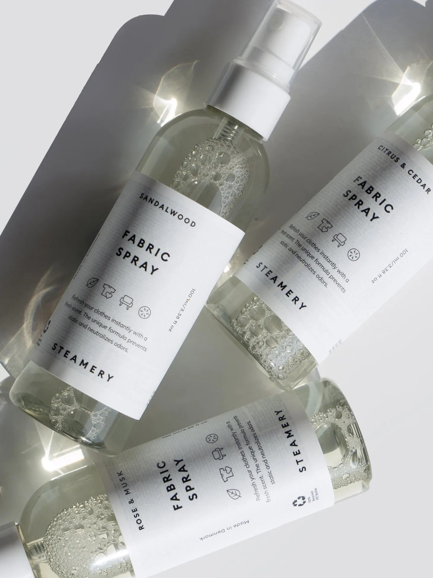 Raikasta vaatteesi helposti ja nopeasti pesukertojen välillä. Steameryn tekstiilisuihke neutralisoi hajuja, vähentää sähköisyyttä ja antaa tekstiileillesi miellyttävän santelipuun tuoksun saaden ne tuntumaan vastapestyiltä. Tekstiilisuihke sopii kaikille kankaille. 100ml kierrätystä muovista valmistettu pullo on kätevä ottaa myös matkalle mukaan. Tuotetta ei ole testattu eläimillä.