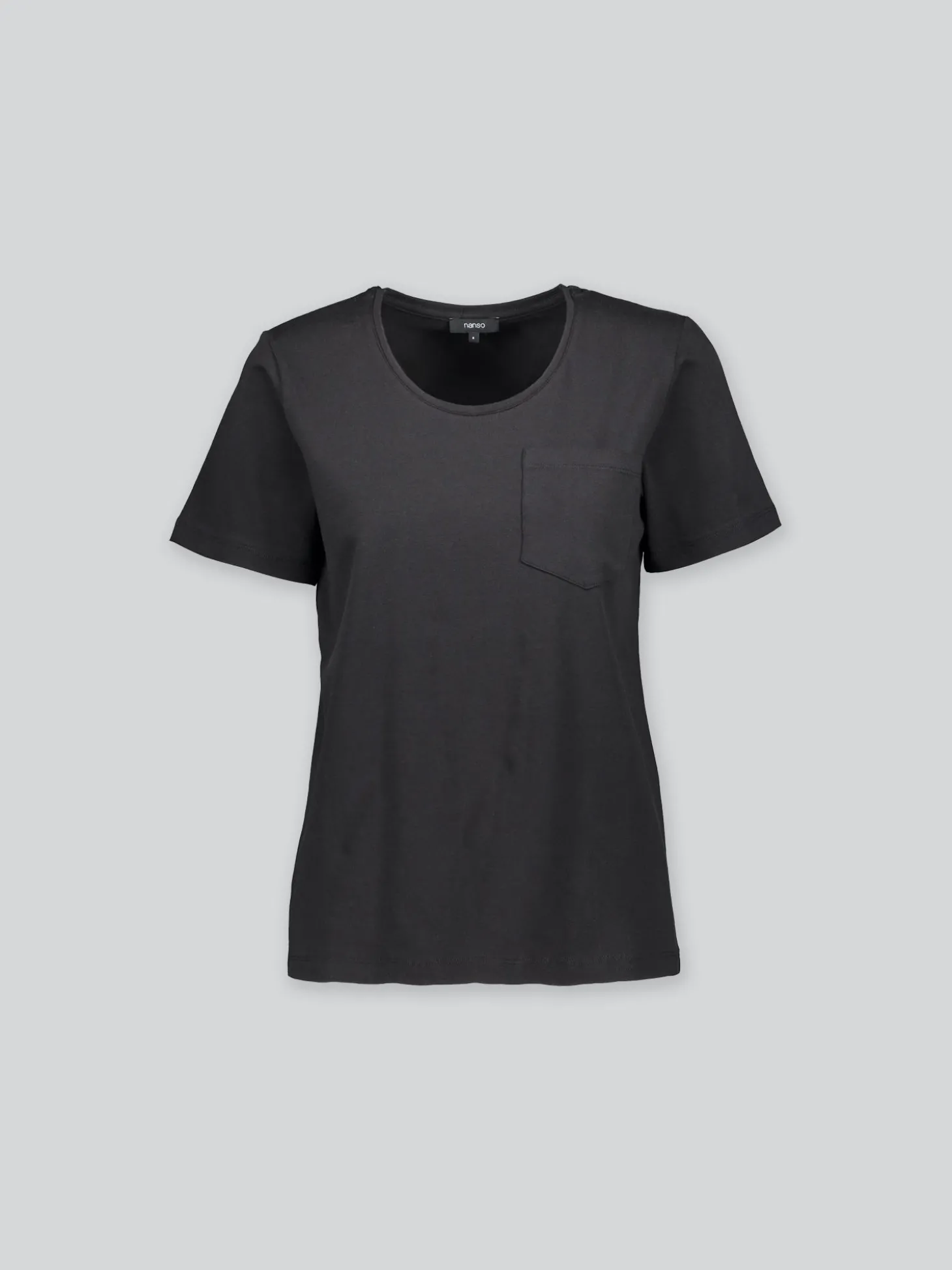 Naisten tyylikäs valkoinen Tasku t-paita pyöreällä pääntiellä. Klassiseen t-paitaan voi aina luottaa, sillä se sopii vaivattomasti jokaiseen asuun. Hihat ovat lyhyet ja paidassa on rintatasku. T-paidan pituus koossa M on noin 65 cm. Materiaali on miellyttävää ja joustavaa puuvilla-elastaani-neulosta.