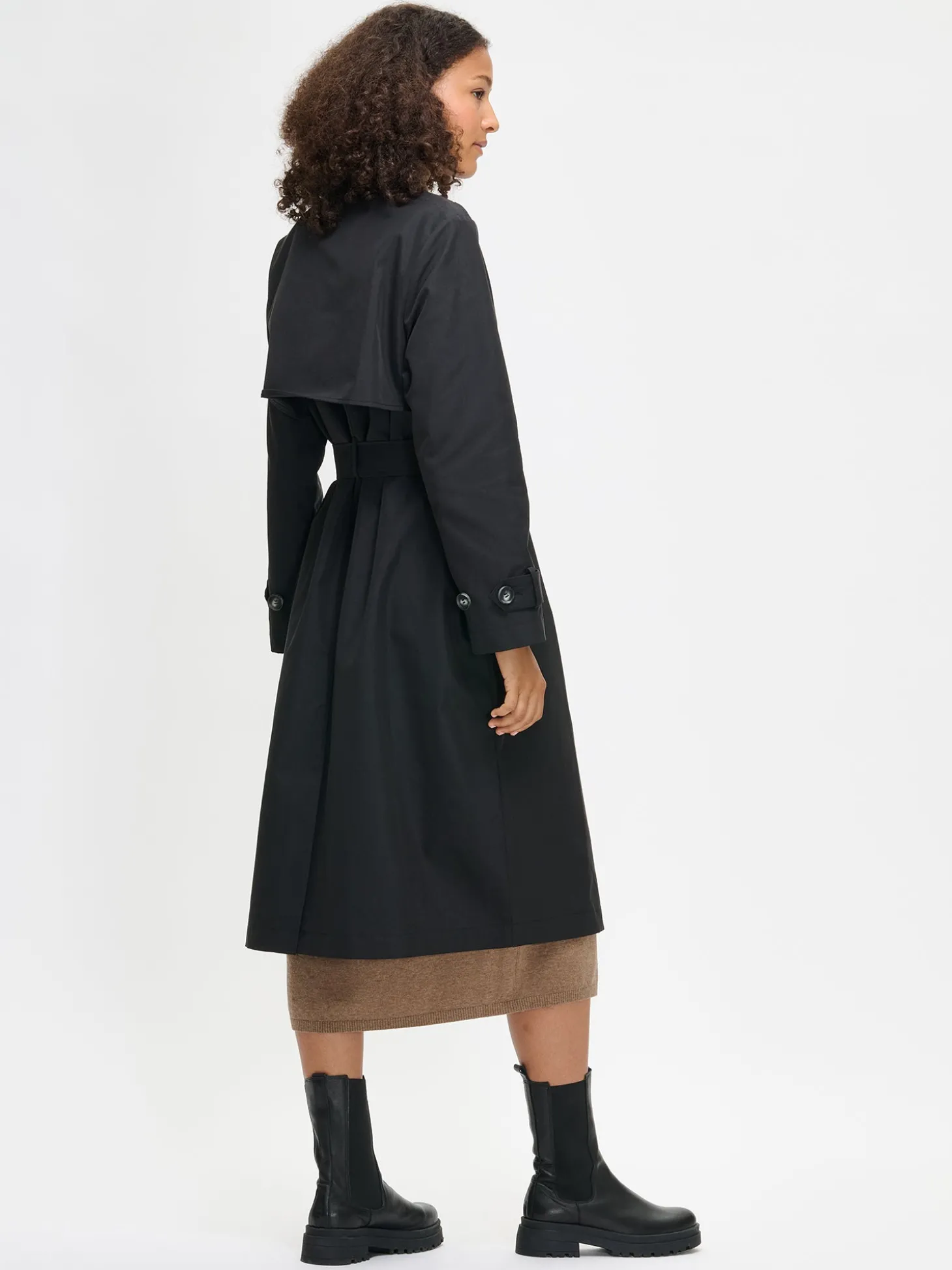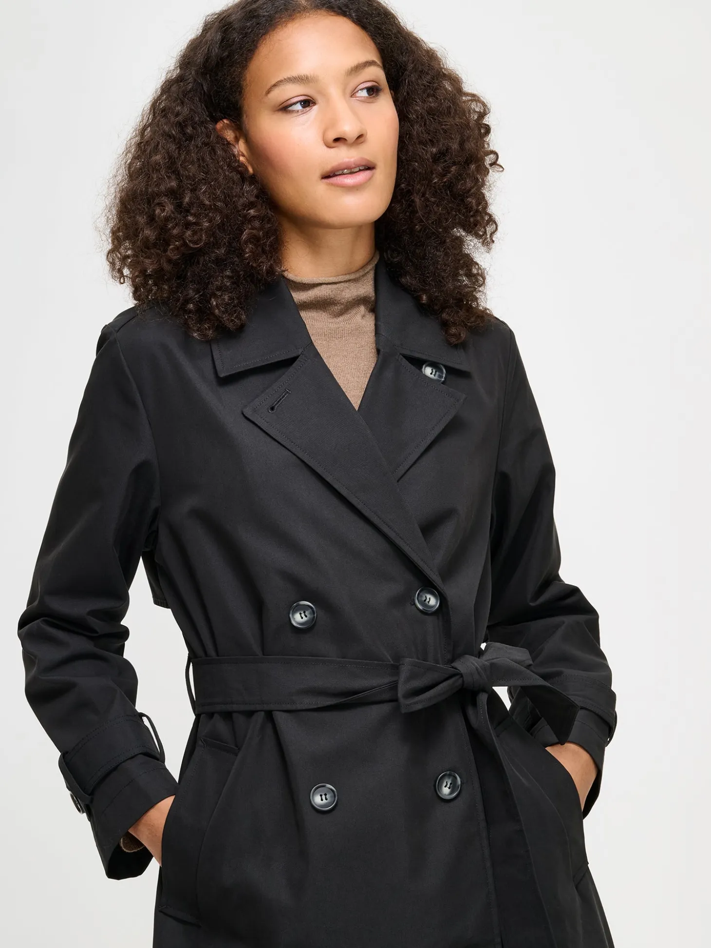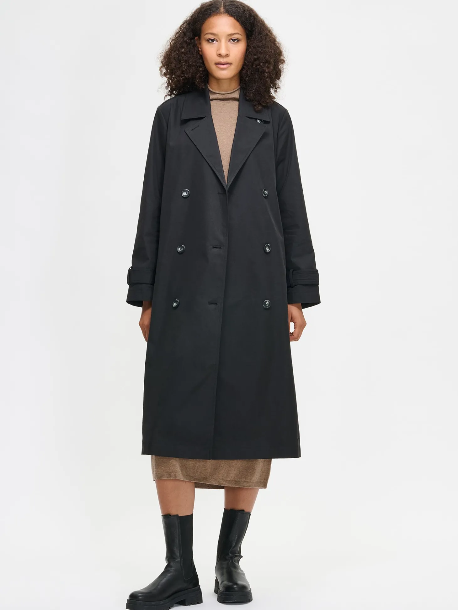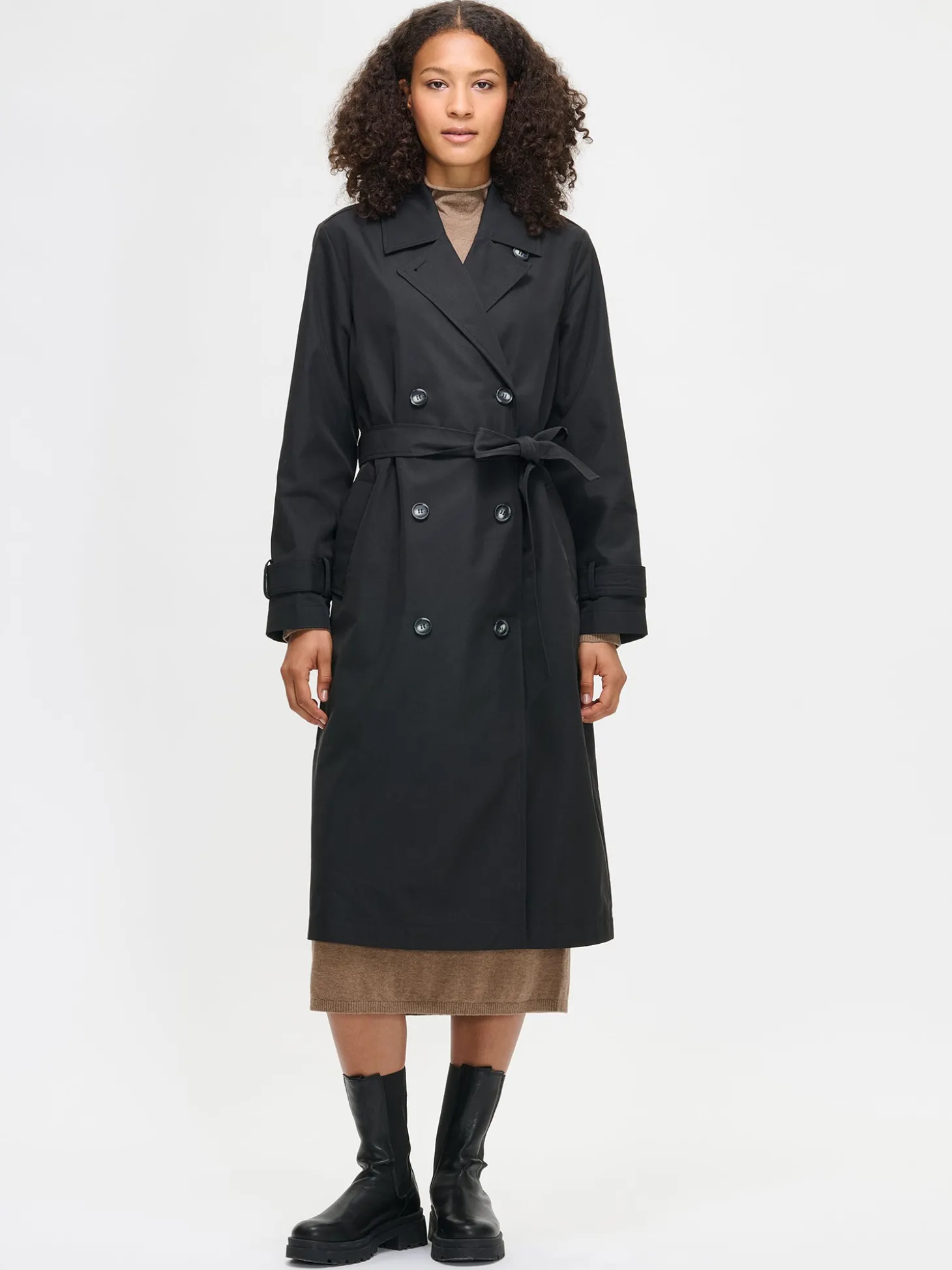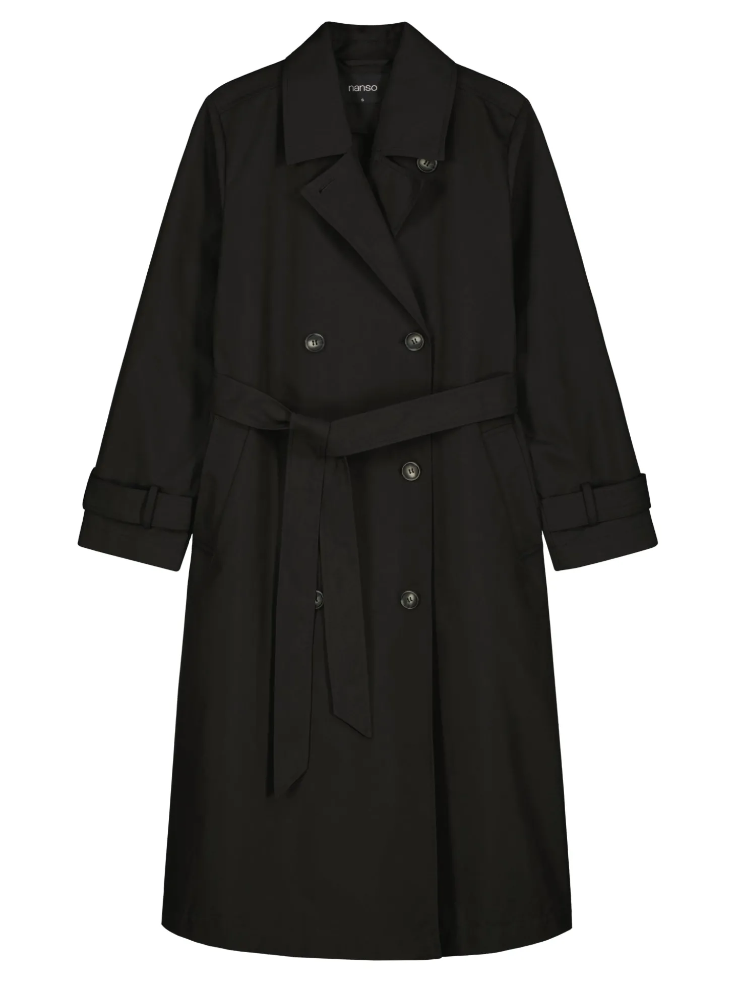 Naisten klassisen musta tyylikäs Trenssi-takki. Takissa on käännekaulus ja kaksirivinen napitus. Täyspitkien hihojen hihansuissa on säätömahdollisuus kahdella napilla. Takissa on listataskut, vyö ja takana halkio. Takin pituus koossa M on noin 120 cm. Materiaali on vettä hylkivää polyesteri-puuvillakangasta.