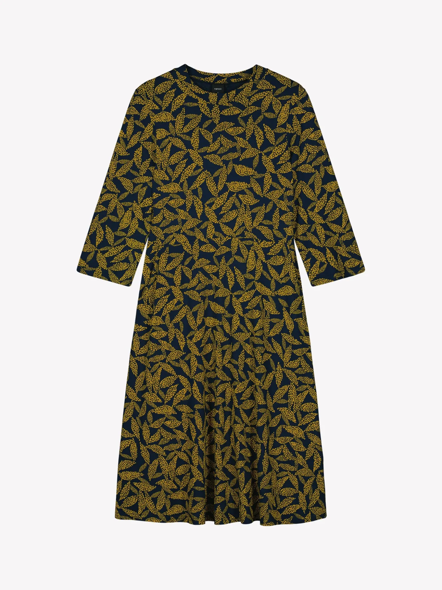 Naisten kuosillinen keltainen Triine-mekko. Mekossa on pieni pystykaulus, sivuissa taskut ja 3/4 pituiset suorat hihat. Mekko on yläosasta istuva ja helmassa on hieman kellotusta. Mekon pituus koossa M on noin 110 cm. Kauniisti laskeutuvan mekon materiaali on laadukasta ja miellyttävän tuntuista, ohutta viskoosi-elastaani-neulosta. Viskoosineulos on sähköistymätöntä ja helppohoitoista. Tuote on valmistettu LENZING™ ECOVERO™ -viskoosista. Materiaalille on ominaista 3-5% kutistuminen ensimmäisessä pesussa.