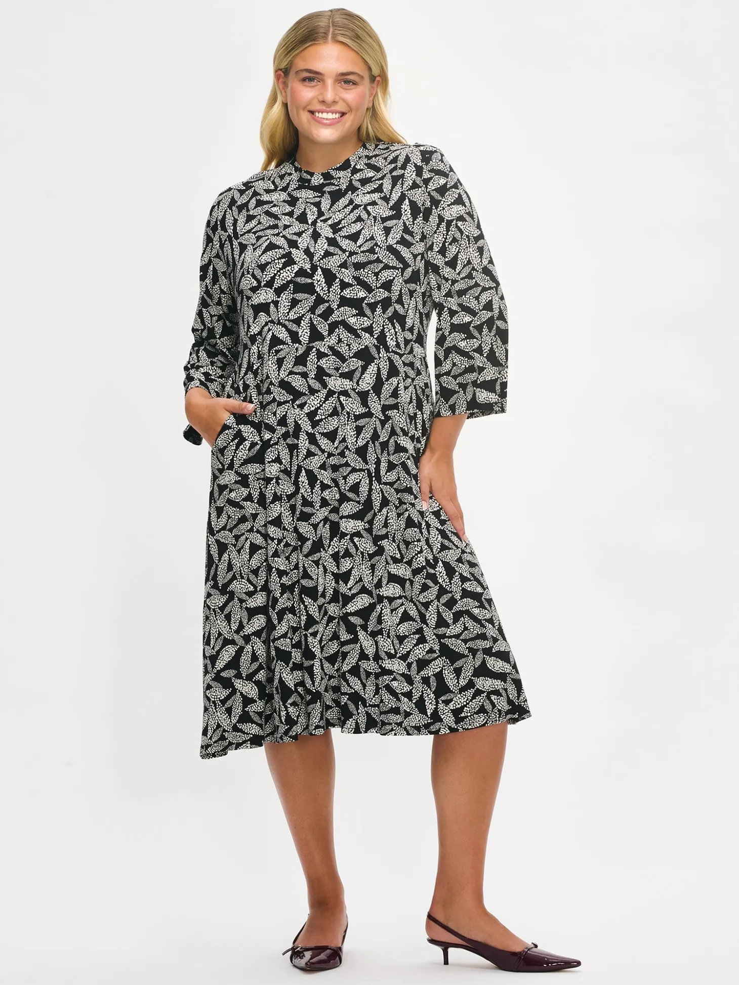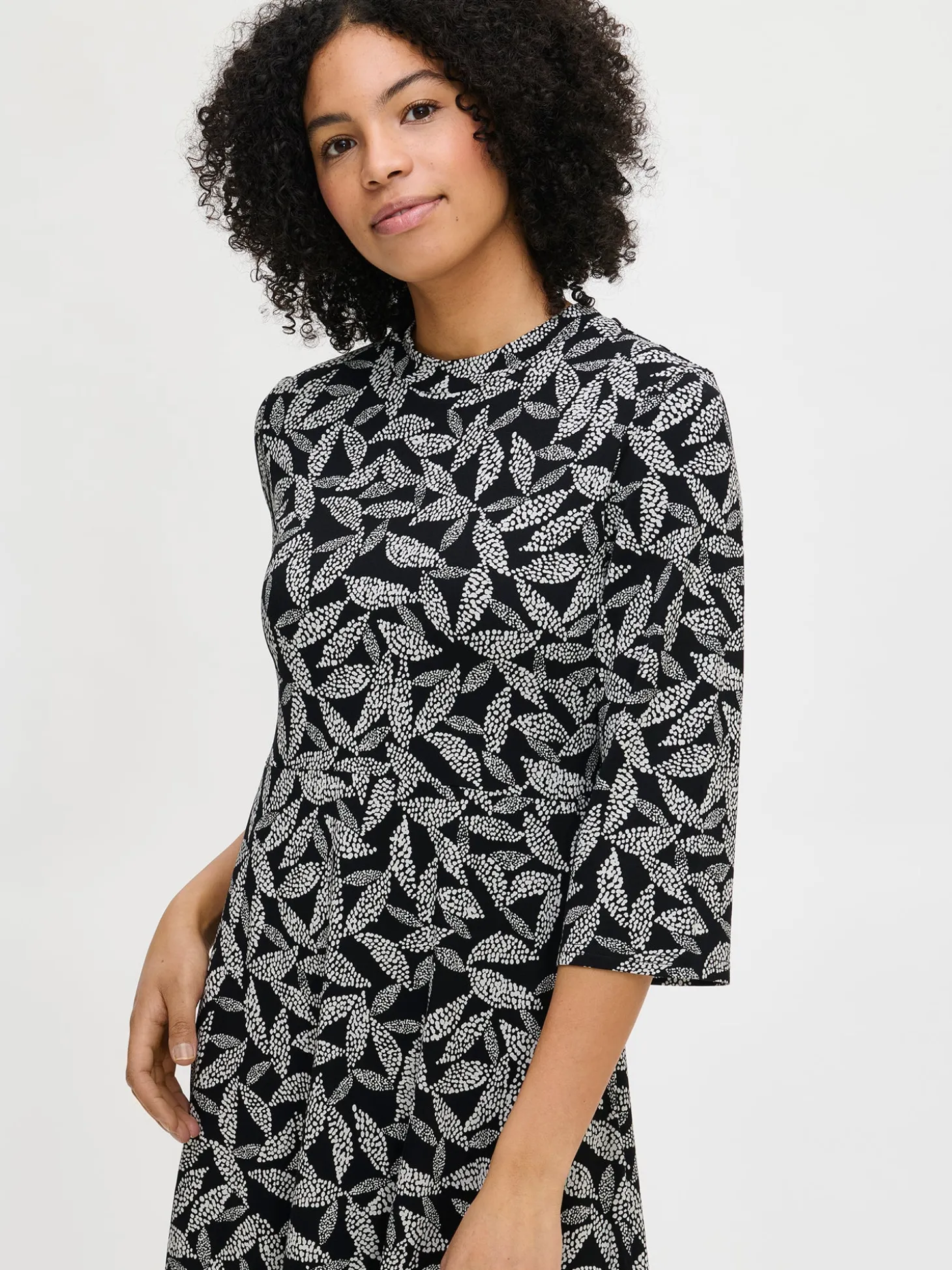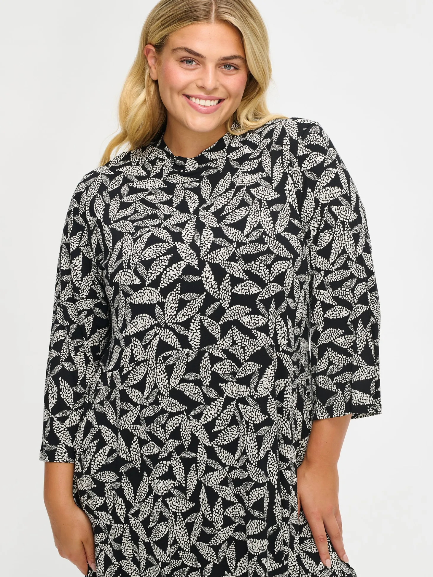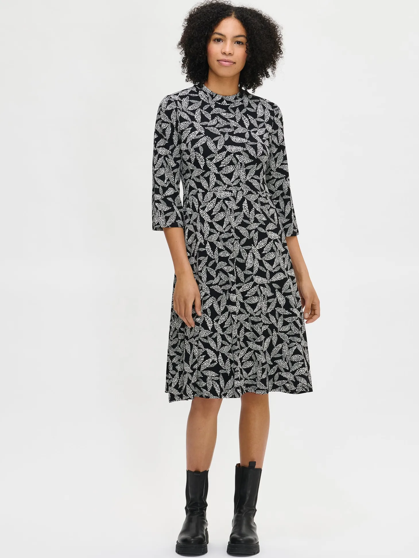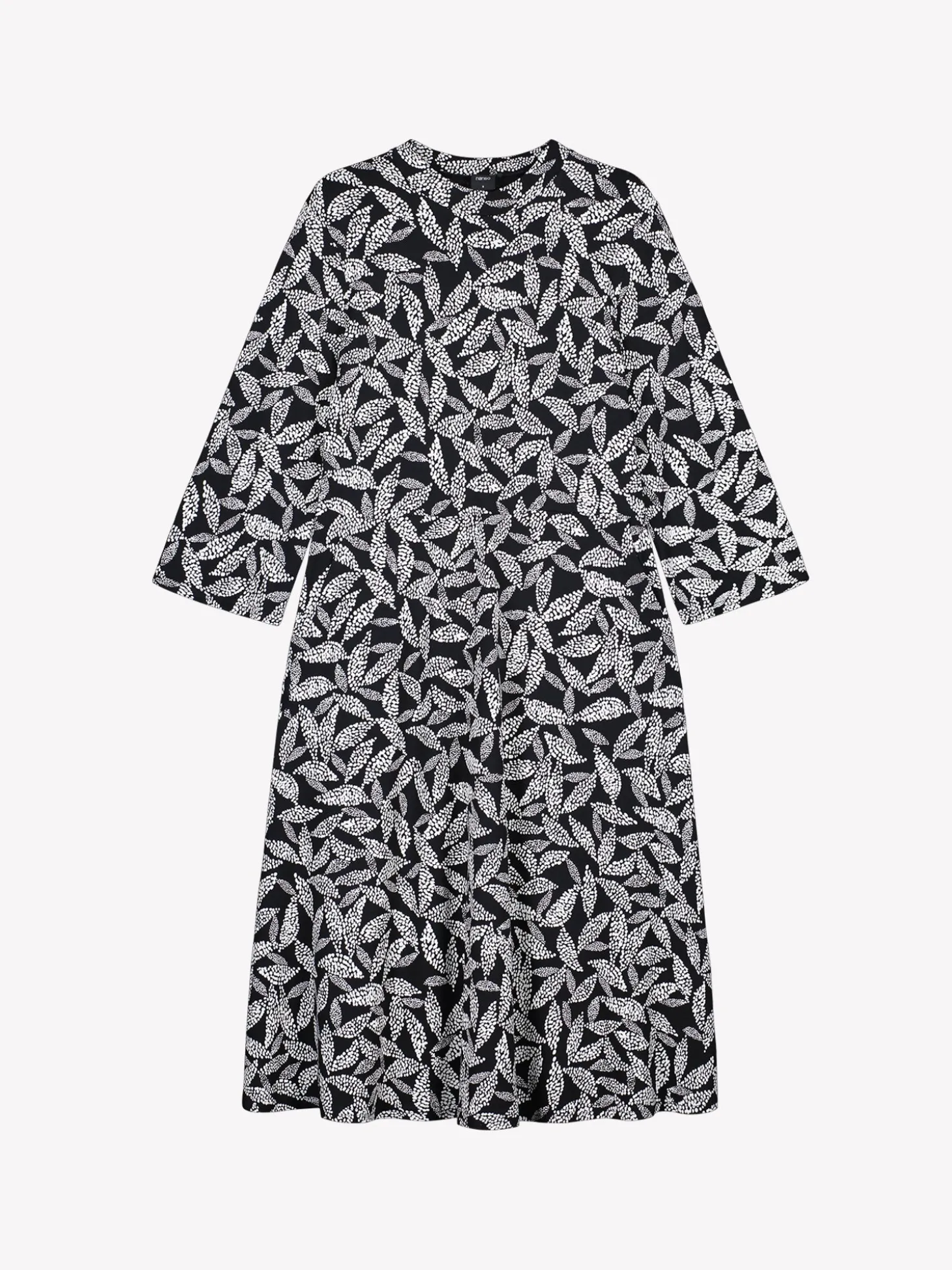 Naisten kuosillinen mustavalkoinen Triine-mekko. Mekossa on pieni pystykaulus, sivuissa taskut ja 3/4 pituiset suorat hihat. Mekko on yläosasta istuva ja helmassa on hieman kellotusta. Mekon pituus koossa M on noin 110 cm. Kauniisti laskeutuvan mekon materiaali on laadukasta ja miellyttävän tuntuista, ohutta viskoosi-elastaani-neulosta. Viskoosineulos on sähköistymätöntä ja helppohoitoista. Tuote on valmistettu LENZING™ ECOVERO™ -viskoosista. Materiaalille on ominaista 3-5% kutistuminen ensimmäisessä pesussa.