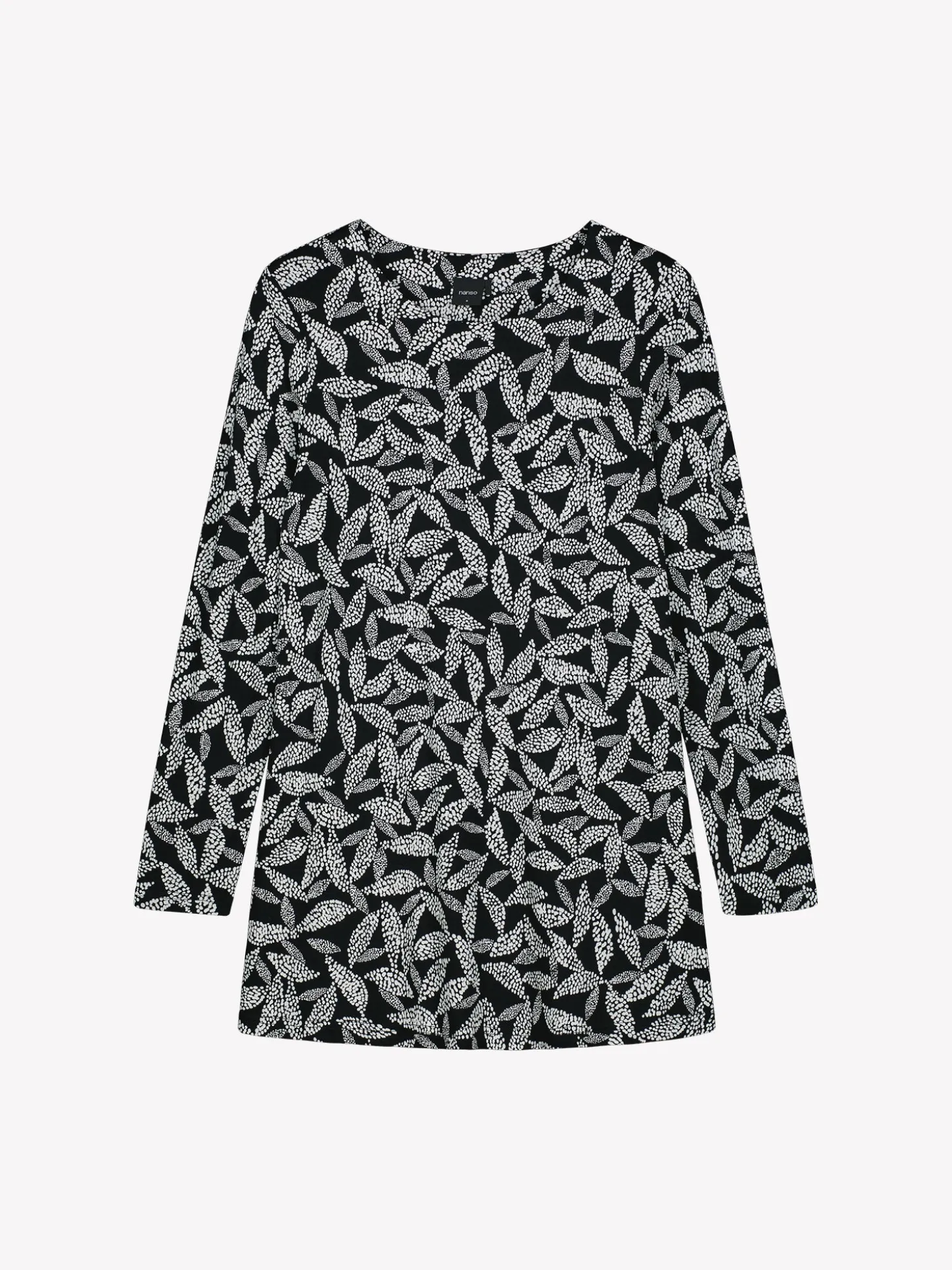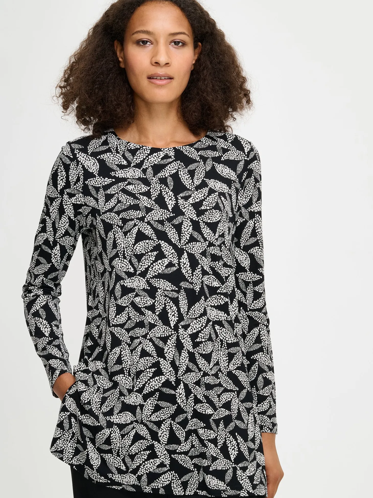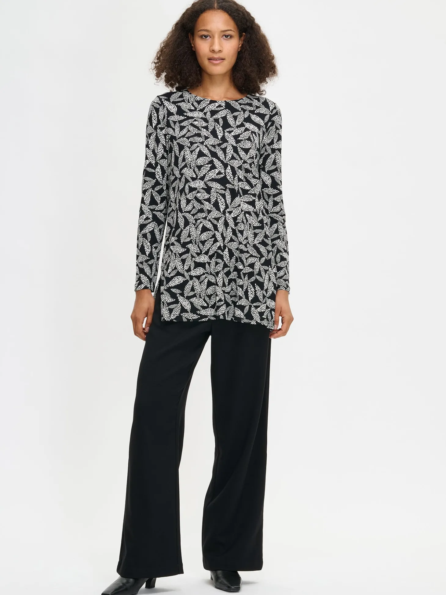 Naisten kuosillinen mustavalkoinen Triine-tunika. Tunikassa on alavaralla viimeistelty pyöreä pääntie, sivuissa halkiot ja täyspitkät hihat. Tunikan helma on kauniisti kellotettu. Tunikan pituus koossa M on noin 80 cm. Kauniisti laskeutuvan tunikan materiaali on laadukasta ja miellyttävän tuntuista, ohutta viskoosi-elastaani-neulosta. Viskoosineulos on sähköistymätöntä ja helppohoitoista. Tuote on valmistettu LENZING™ ECOVERO™ -viskoosista. Materiaalille on ominaista 3-5% kutistuminen ensimmäisessä pesussa.