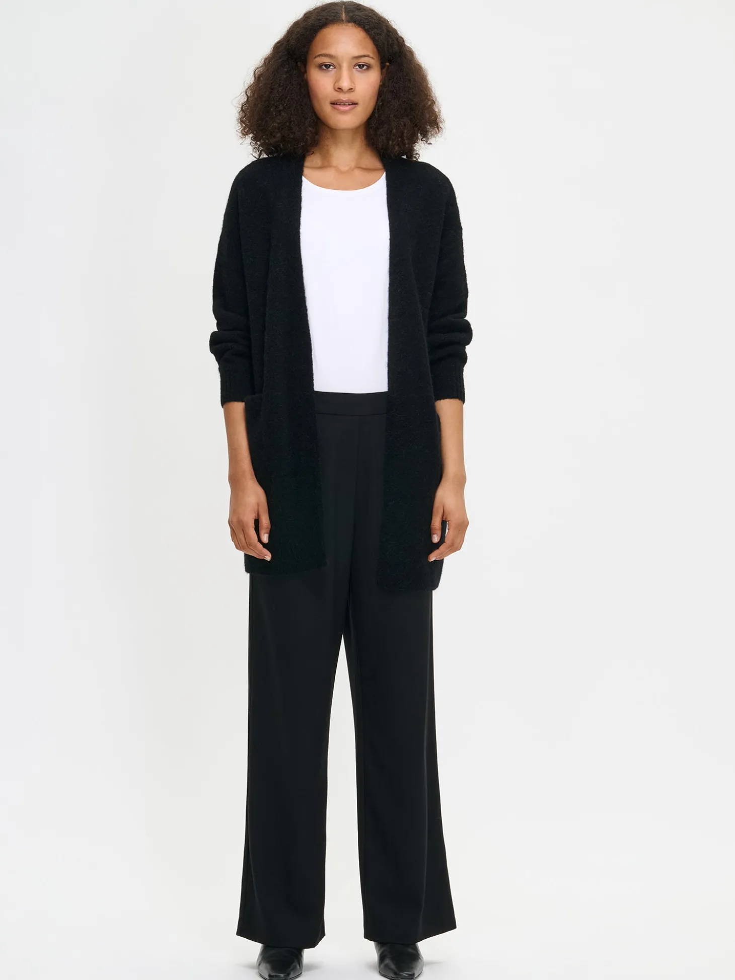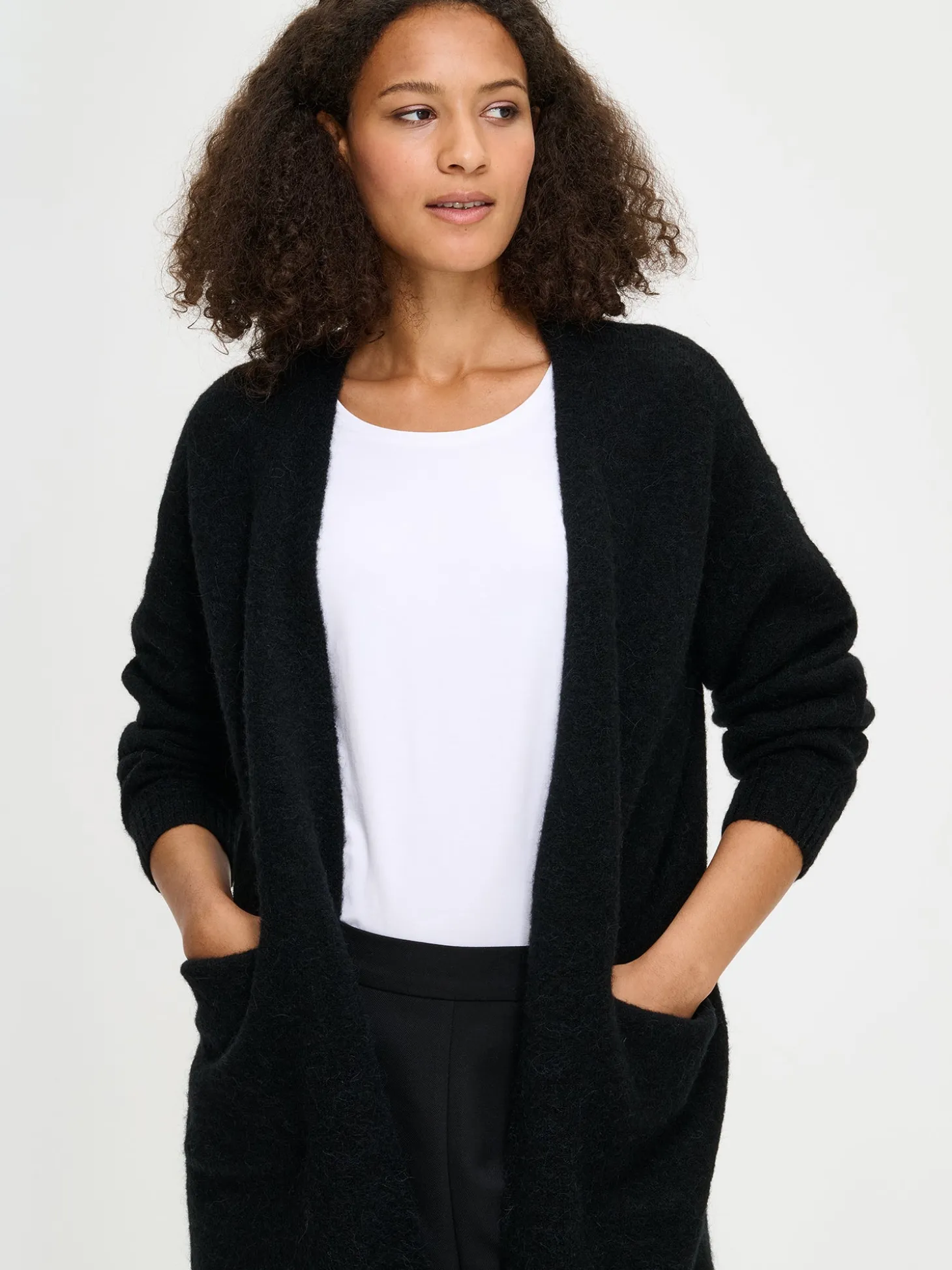 Naisten ylellinen musta Tuohi-neuletakki. Pitkähihaisessa neuletakissa on edessä taskut ja resorit hihansuissa sekä helmassa. Pehmeä neulos laskeutuu kauniisti ja tuntuu miellyttävältä päällä. Pituus koossa M on noin 80 cm. Neuleen hoito-ohjeet löydät .