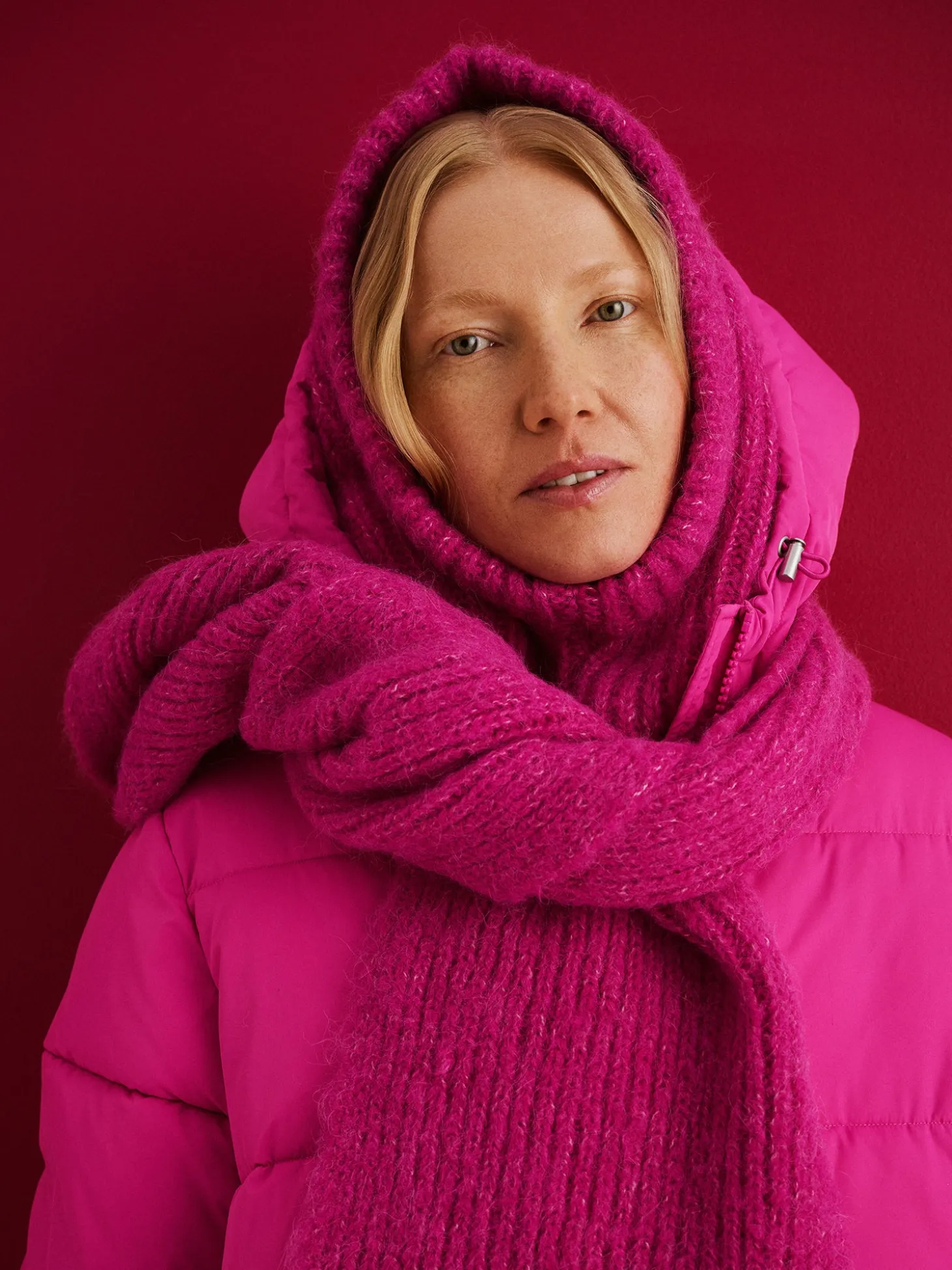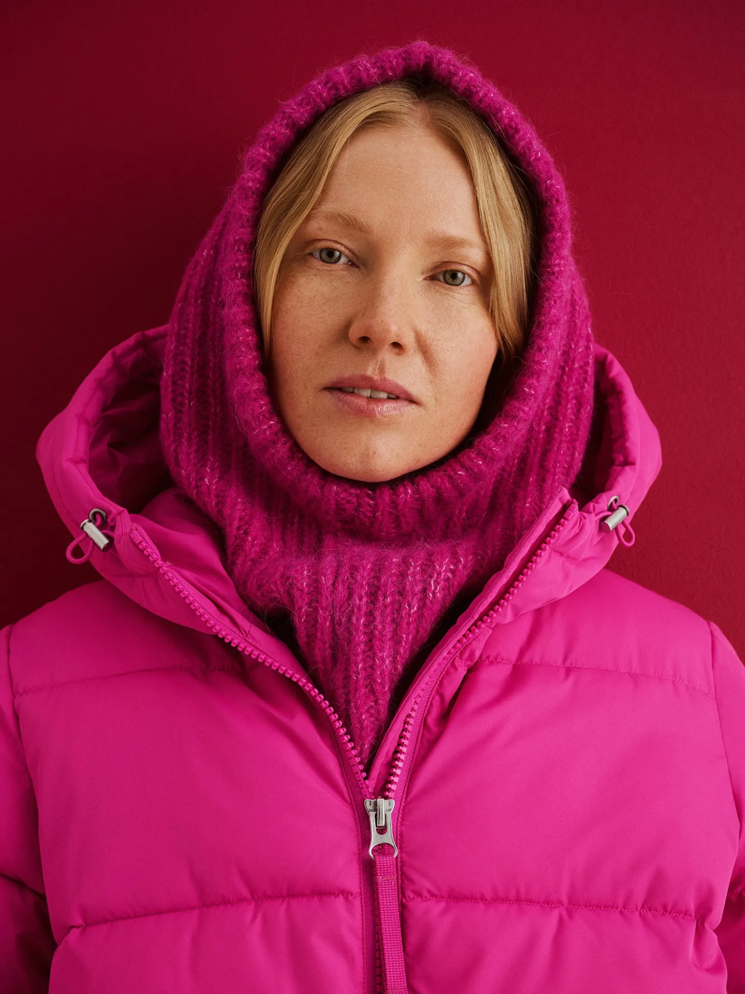 Naisten muhkea ja trendikäs pinkki Usva-neulehuppu. Huppu pitää samalla sekä pään että kaulan lämpimänä. Neulos on laadukasta, pehmeän ja miellyttävän tuntuista setifioitua villa-alpakka-sekoitetta. Neuleen hoito-ohjeet löydät