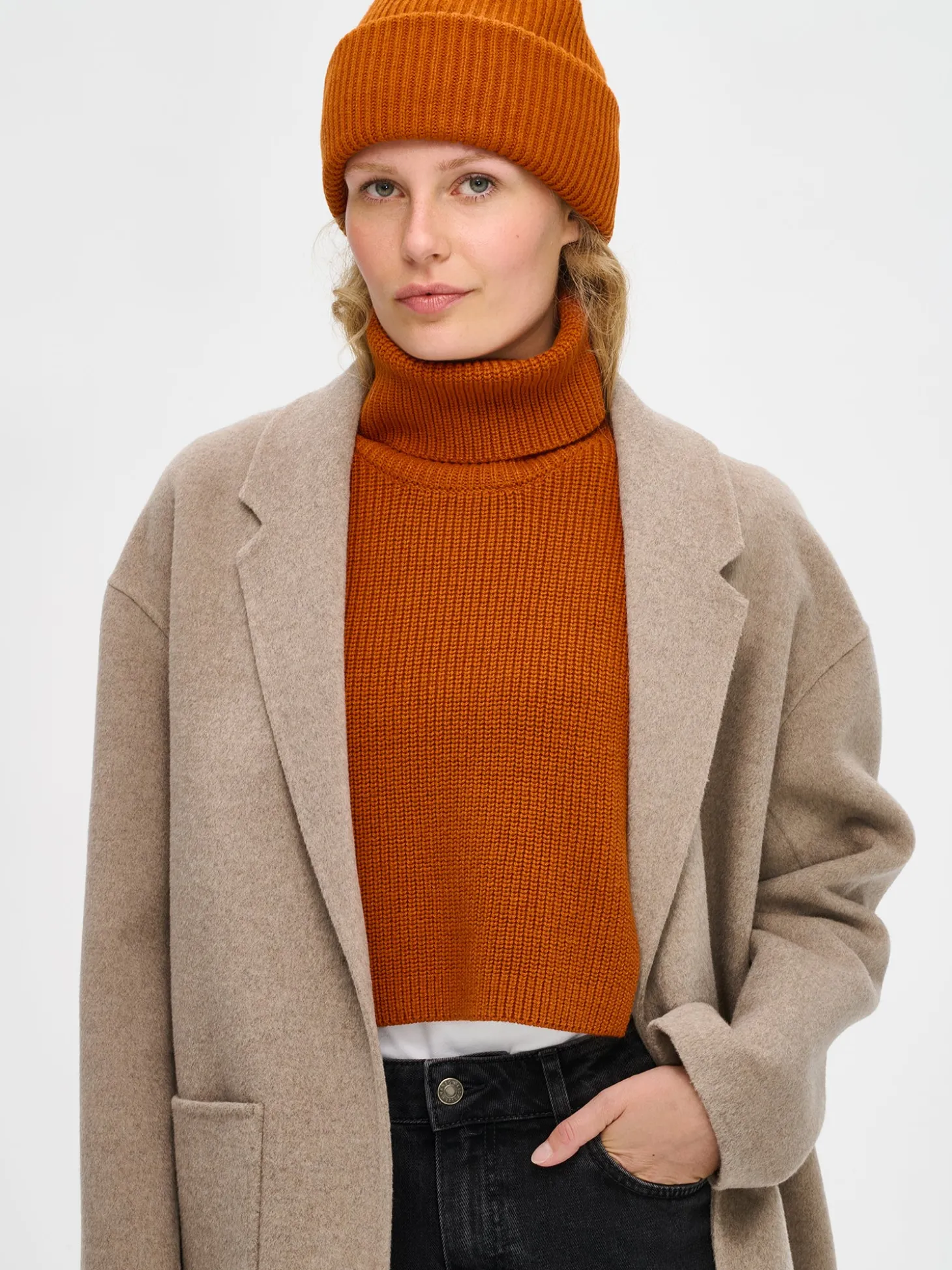 Naisten tyylikäs oranssin ruskea Utu-patenttineulekauluri. Mukava ja lämmin kauluri suojaa tuulisella säällä ja se on helppo pukea takin alle. Yhdistä kauluri pehmeään syksyn ja talven kylmyyteen Neulekaulurissa on taittuva pystykaulus. Neulekaulurin pituus olalta on noin 40 cm. Neulos on laadukasta, pehmeän ja miellyttävän tuntuista puuvilla-villa-sekoitetta. Tuotteessa käytetty villa on sertifioitua. Neuleen hoito-ohjeet löydät