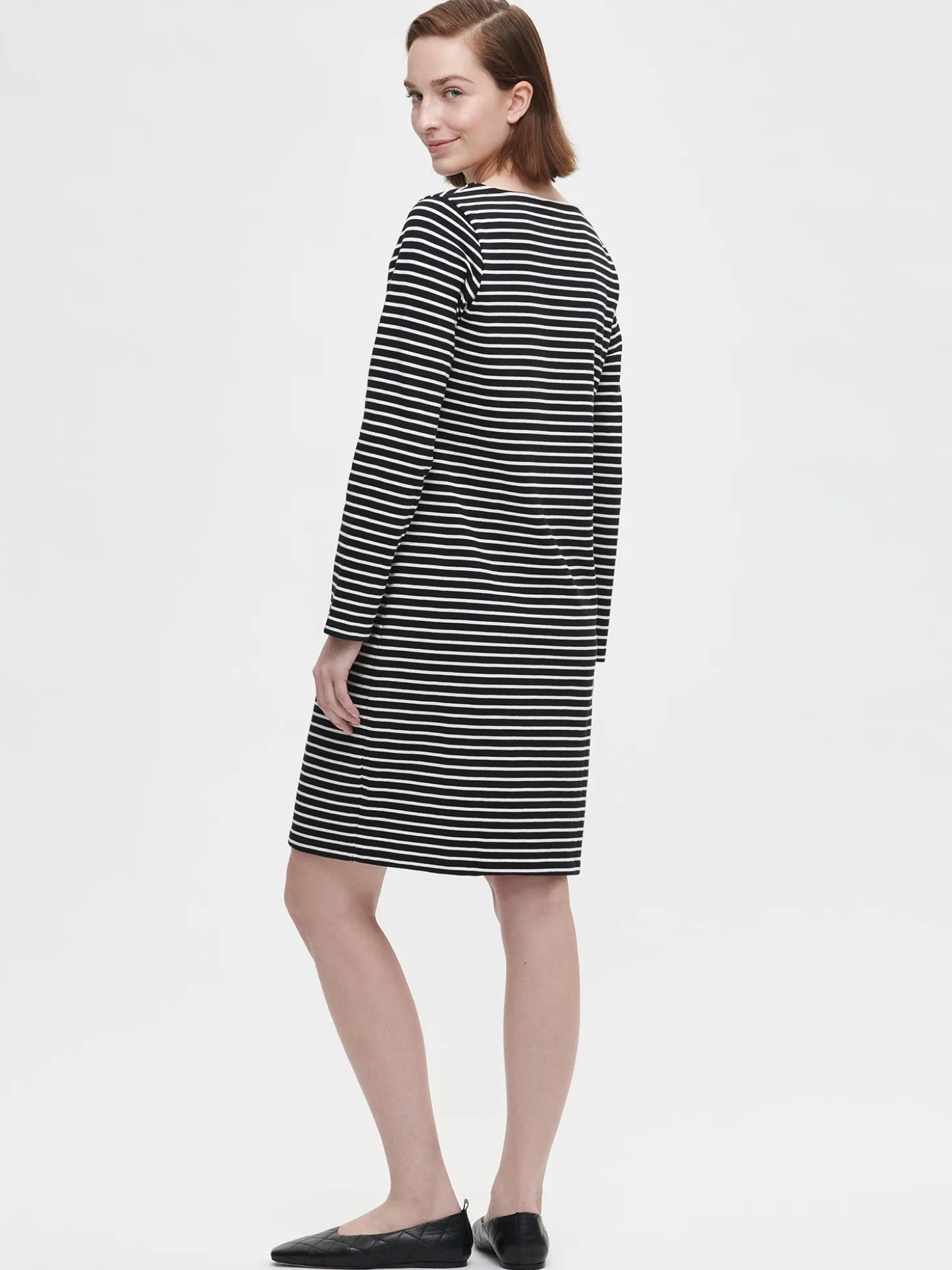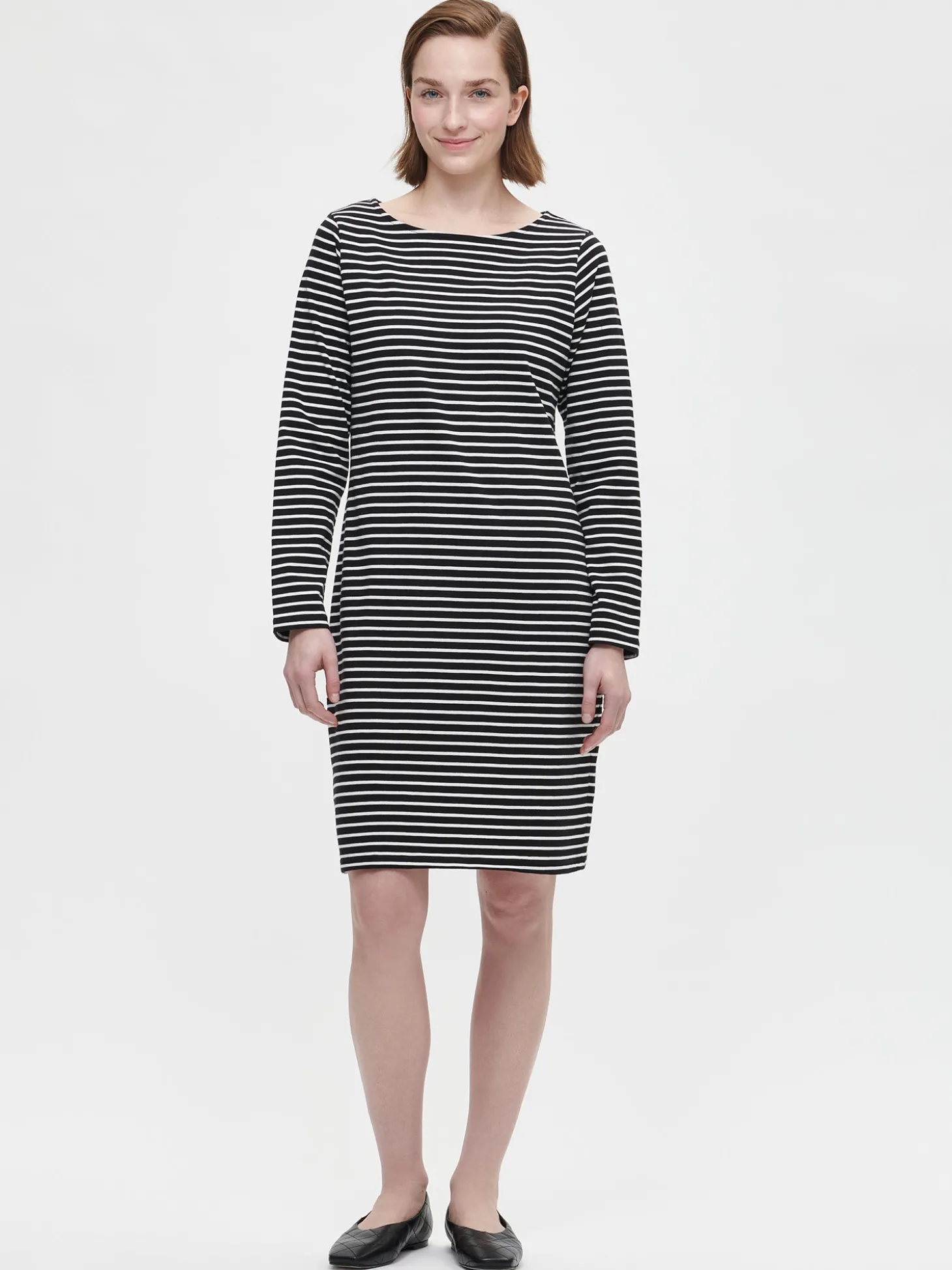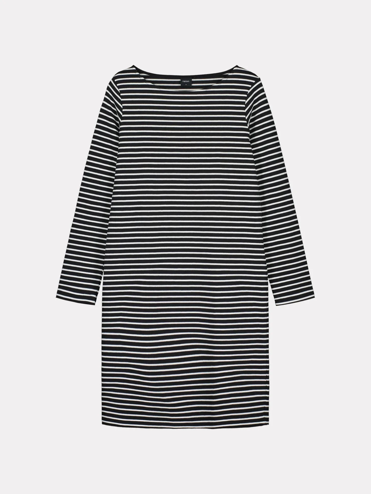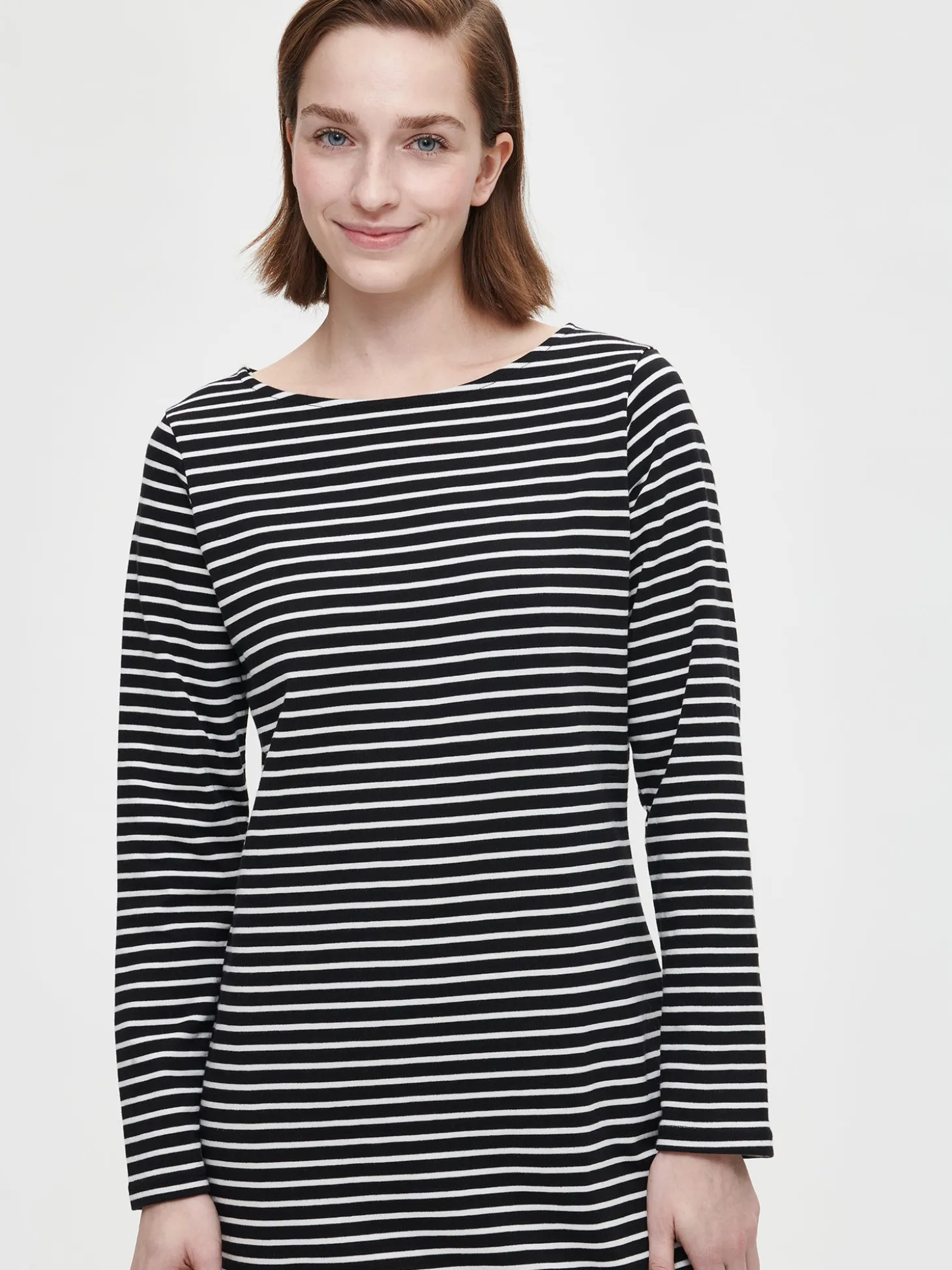 Naisten raidallinen mustavalkoinen Vaaka-mekko. Pitkähihainen ja istuva mekko on arjen luottovaate, johon voi pukeutua ympäri vuoden. Yhdistä mekko kesällä sandaalien tai ballerinojen kanssa ja talvella sukkahousujen ja saappaiden. Kauniissa istuvassa mekossa on kantilla viimeistelty venepääntie ja täyspitkät hihat. Mekon pituus koossa M on noin 100 cm. Materiaali on miellyttävän tuntuista ja helppohoitoista puuvillaneulosta. Materiaalille on ominaista 3-5% kutistuminen ensimmäisessä pesussa. Pesun jälkeen muotoile tuote kosteana.