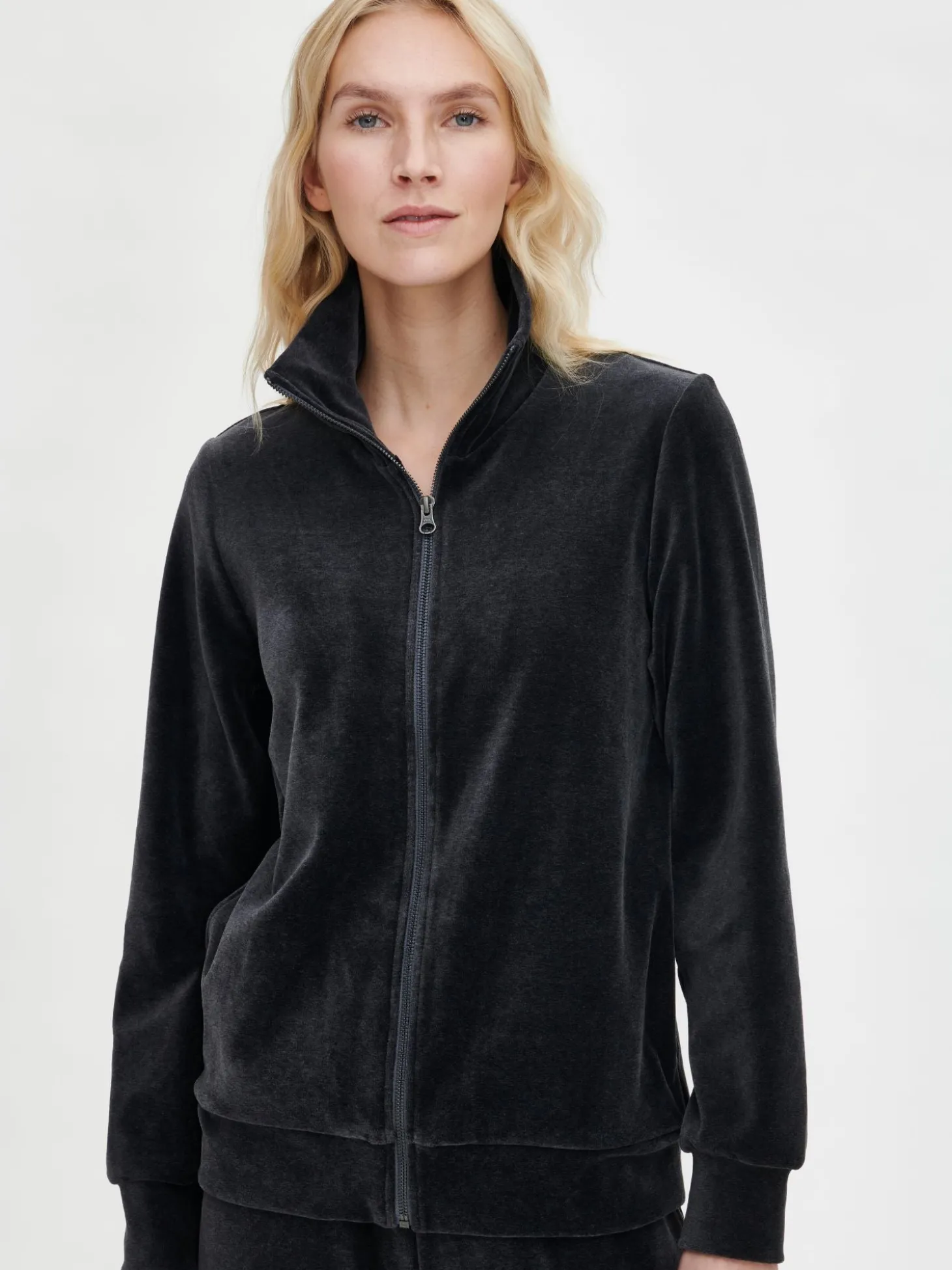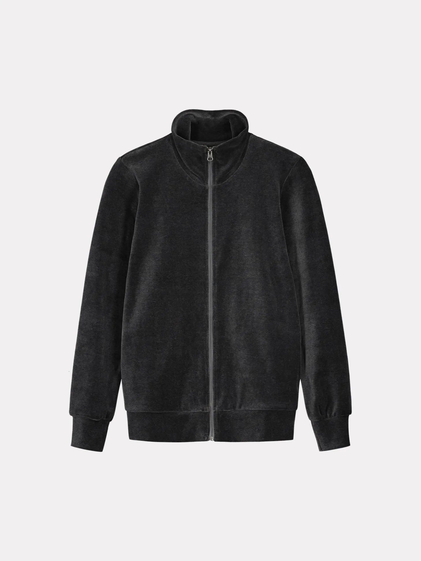 Naisten rento meleeratun harmaa Veluuri-takki pitkillä hihoilla ja pystykauluksella. Takissa on vetoketju ja sivutaskut. Takin pituus koossa M on noin 65 cm. Materiaali on laadukasta ja pehmeää puuvilla-polyesteriveluuria. Materiaalille on ominaista 3-5% kutistuminen ensimmäisessä pesussa.