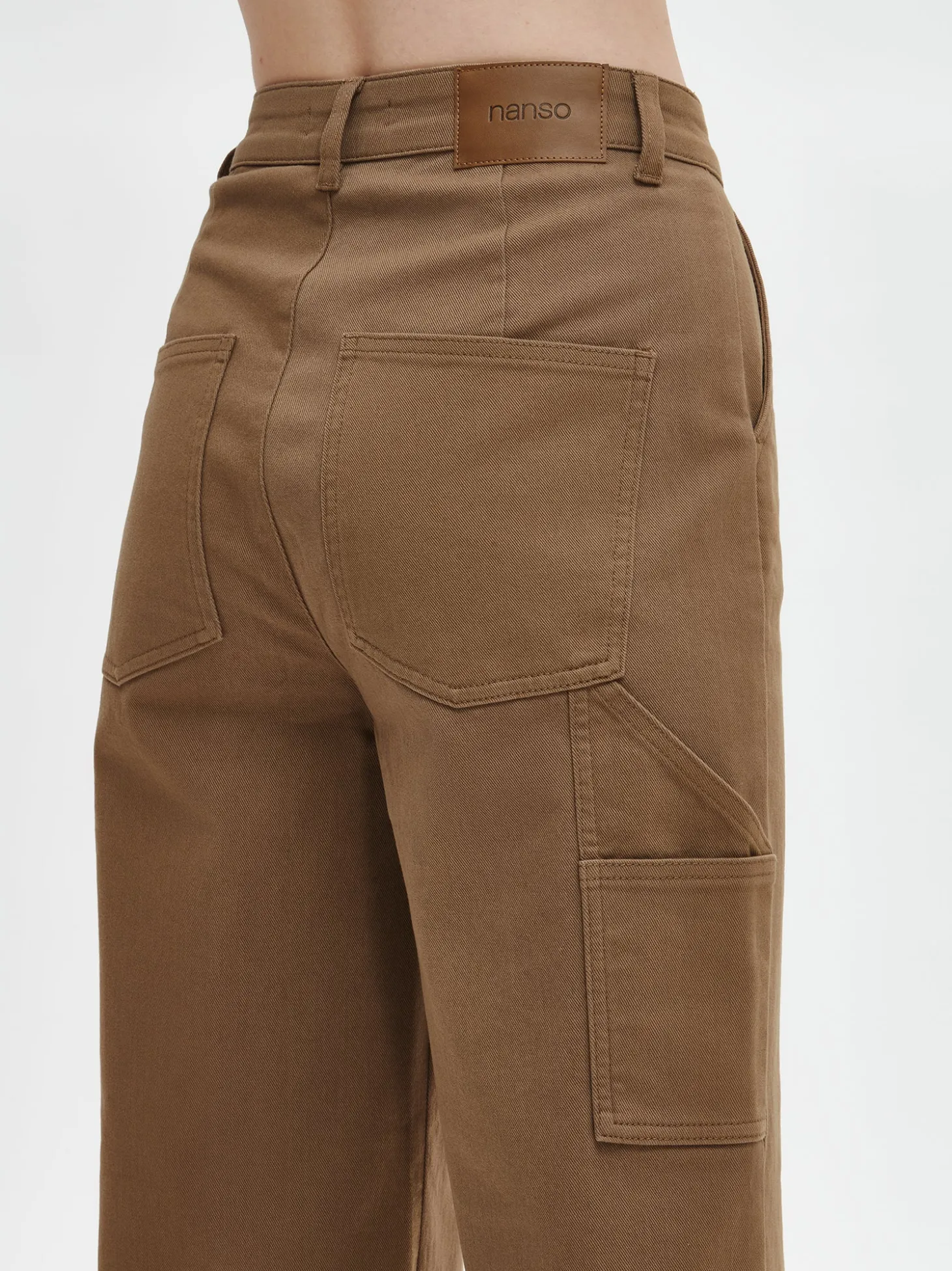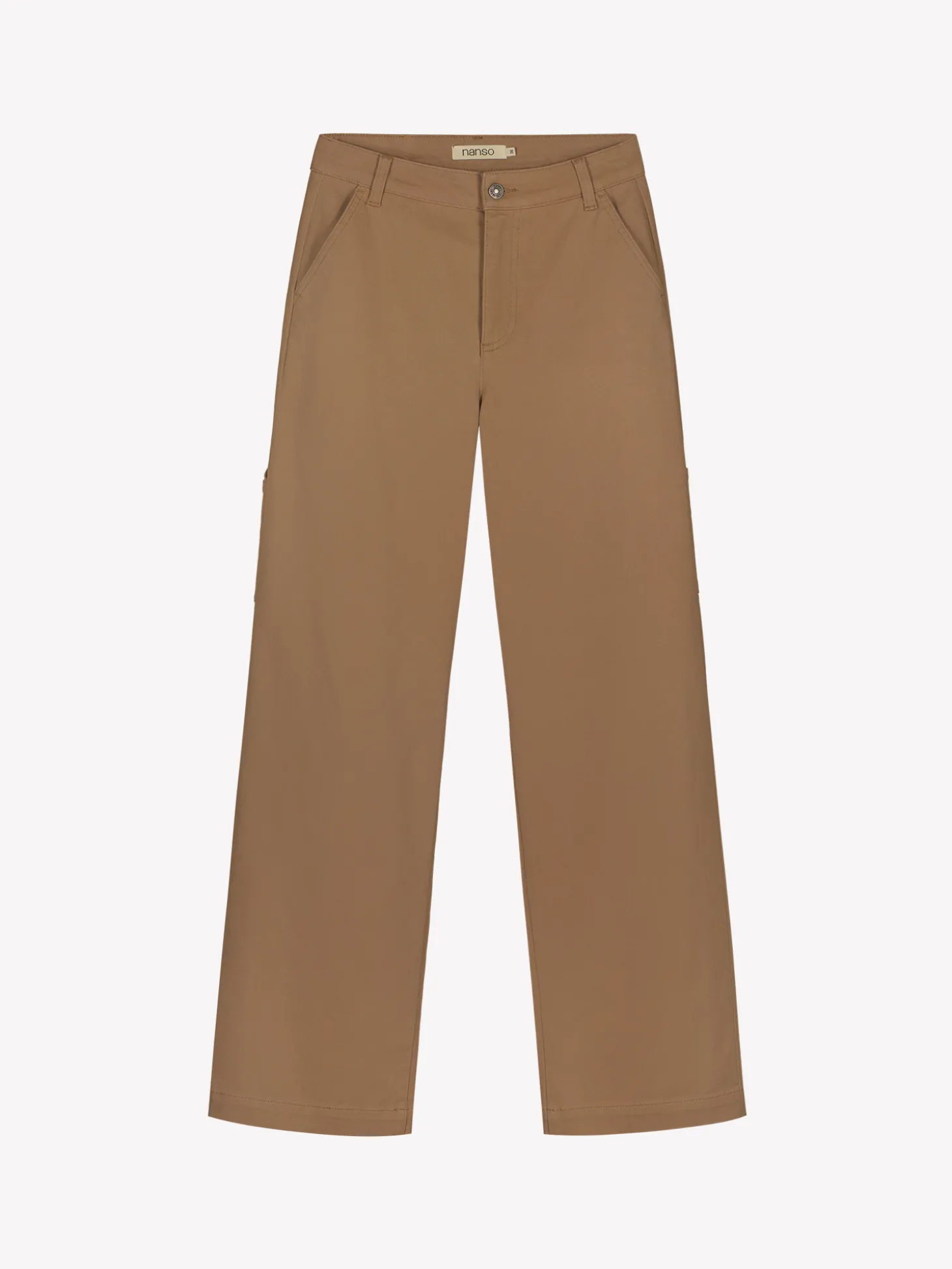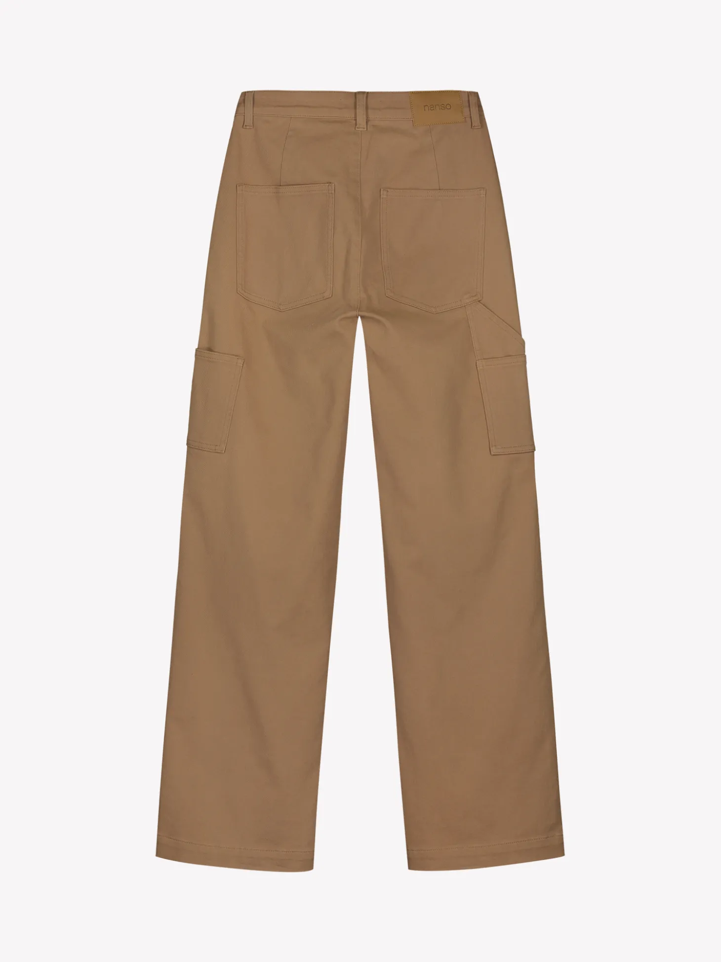 Naisten rennot ruskeat Vera-housut. Housuissa on vyötärökaitale, vyönlenkit ja edessä vetoketju ja nappikiinnitys. Täyspitkissä leveälahkeisissa housuissa on sivu-, taka- ja reisitaskut. Housujen lahkeen sisäpituus koossa 38 on noin 79 cm. Materiaali on kudottua twillsidoksista kestävää puuvillakangasta, jossa on hieman elastaania antamassa joustoa ja käyttömukavuutta.
