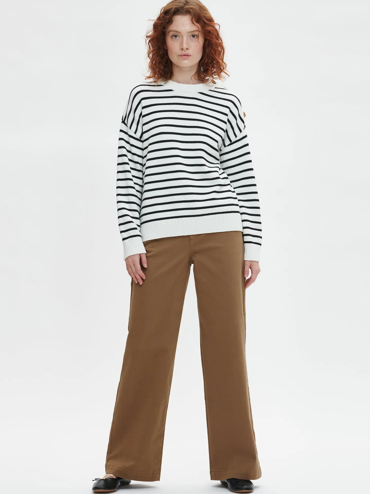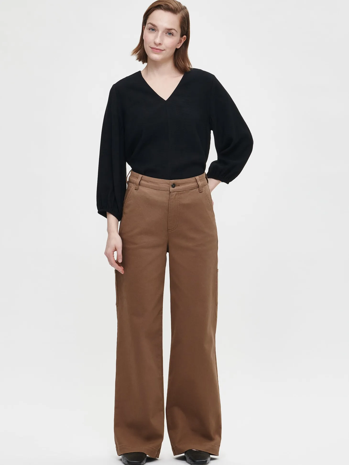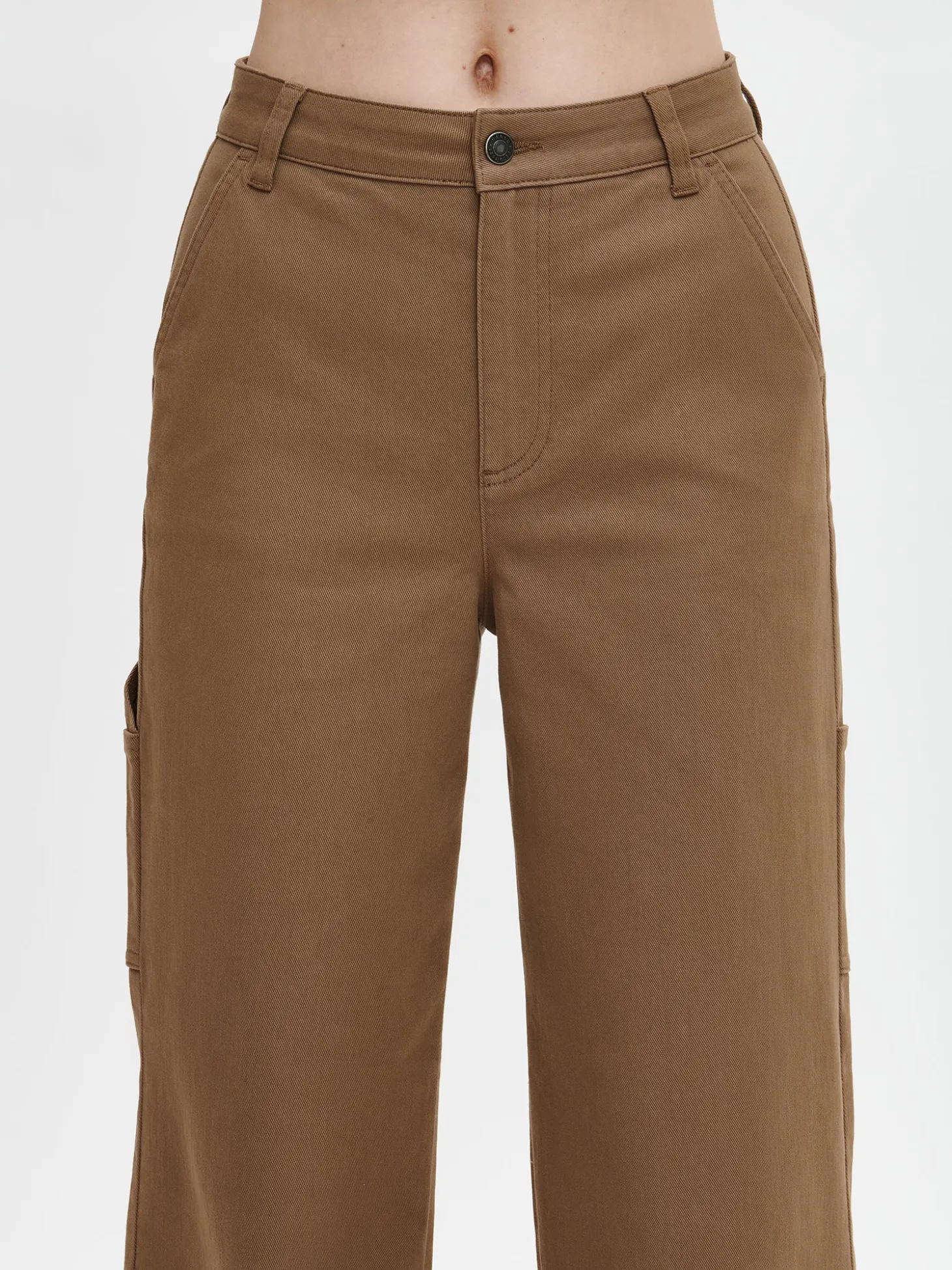Naisten rennot ruskeat Vera-housut. Housuissa on vyötärökaitale, vyönlenkit ja edessä vetoketju ja nappikiinnitys. Täyspitkissä leveälahkeisissa housuissa on sivu-, taka- ja reisitaskut. Housujen lahkeen sisäpituus koossa 38 on noin 79 cm. Materiaali on kudottua twillsidoksista kestävää puuvillakangasta, jossa on hieman elastaania antamassa joustoa ja käyttömukavuutta.