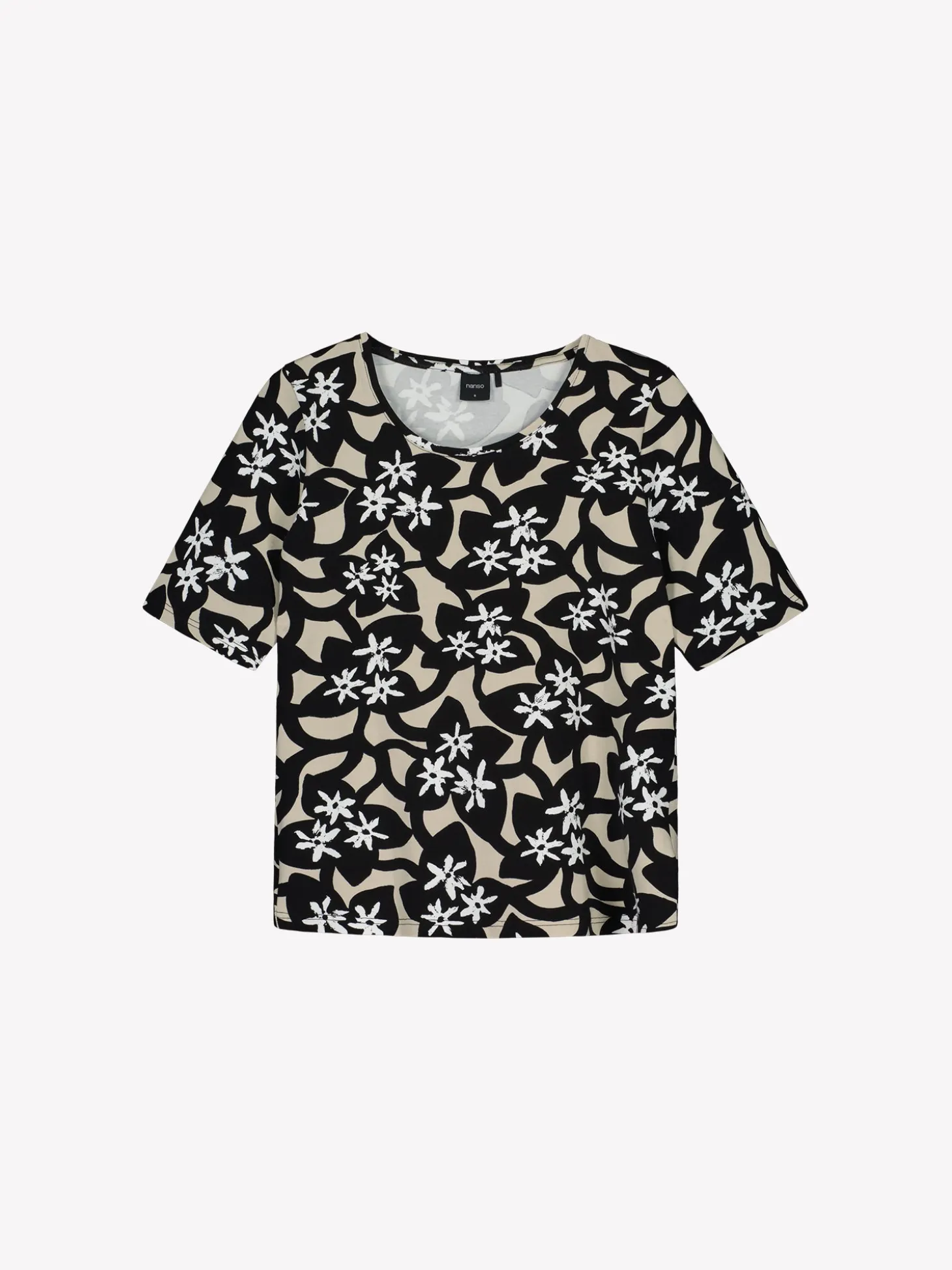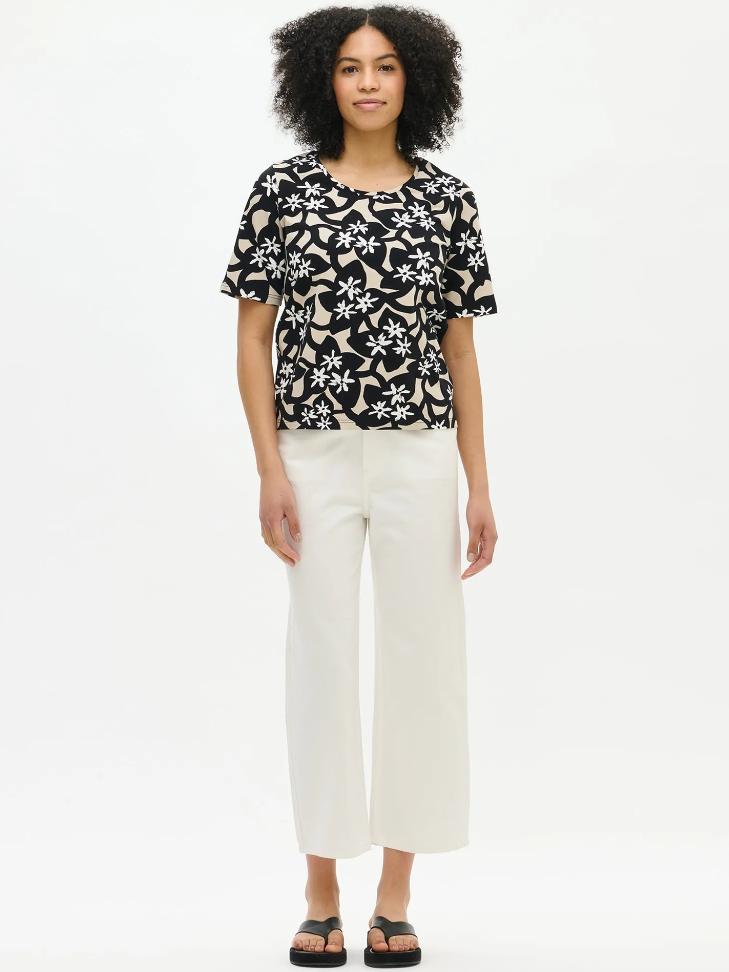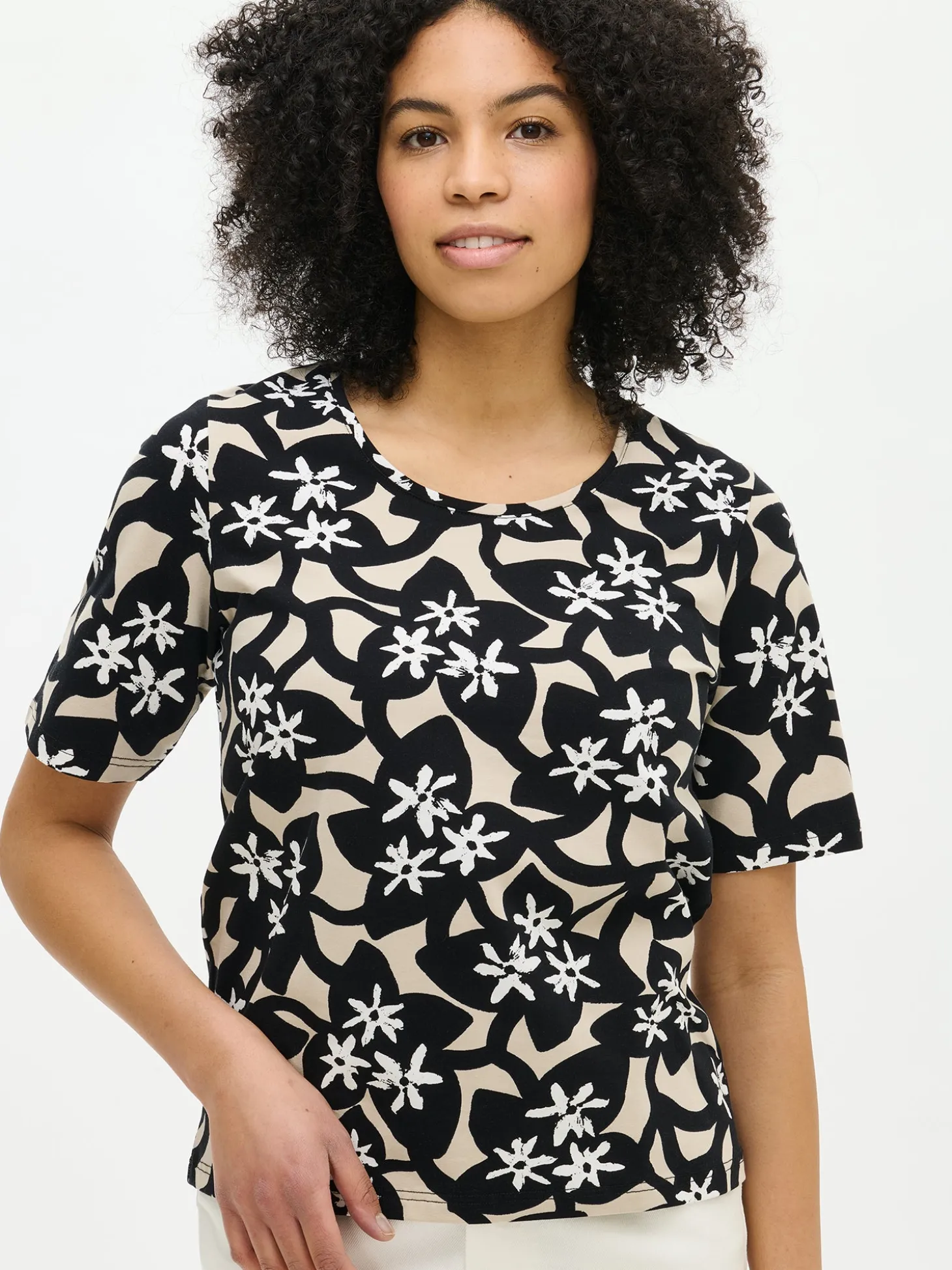 Naisten laadukas kukkakuvioinen musta Verna-t-paita on ihana kesään. Suoralinjaisessa t-paidassa on avara, pyöreä pääntie ja lyhyet 2/4 pituiset hihat. T-paidan pituus koossa M on noin 64 cm. Materiaali on laadukasta ja helppohoitoista puuvilla-elastaani-neulosta, joka pysyy hyvänä pesusta toiseen.