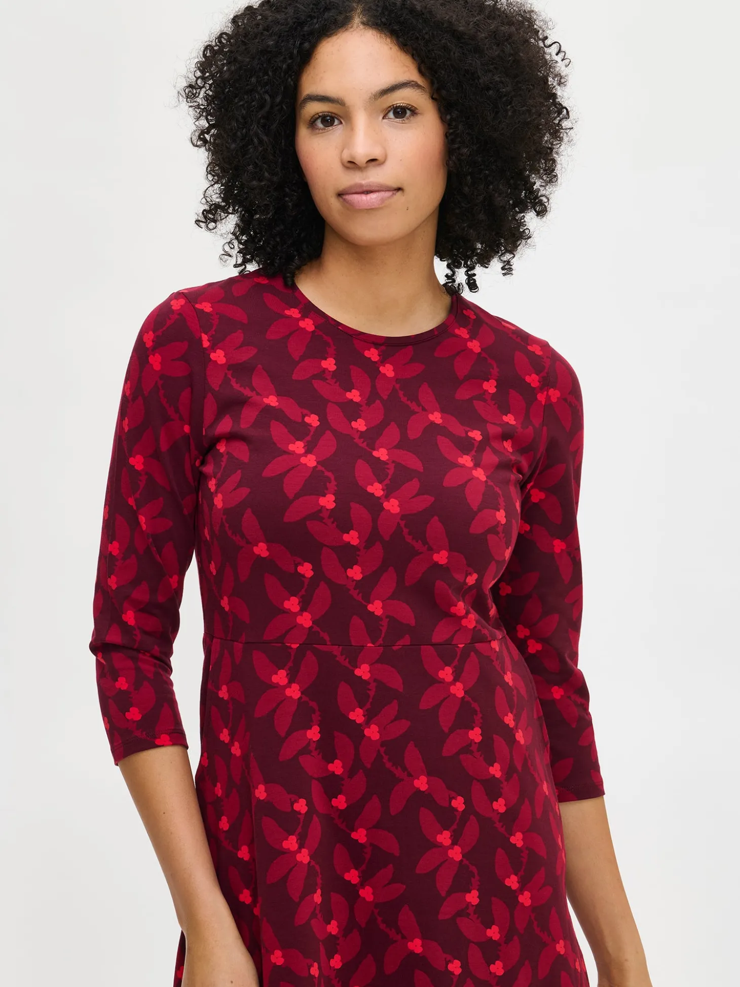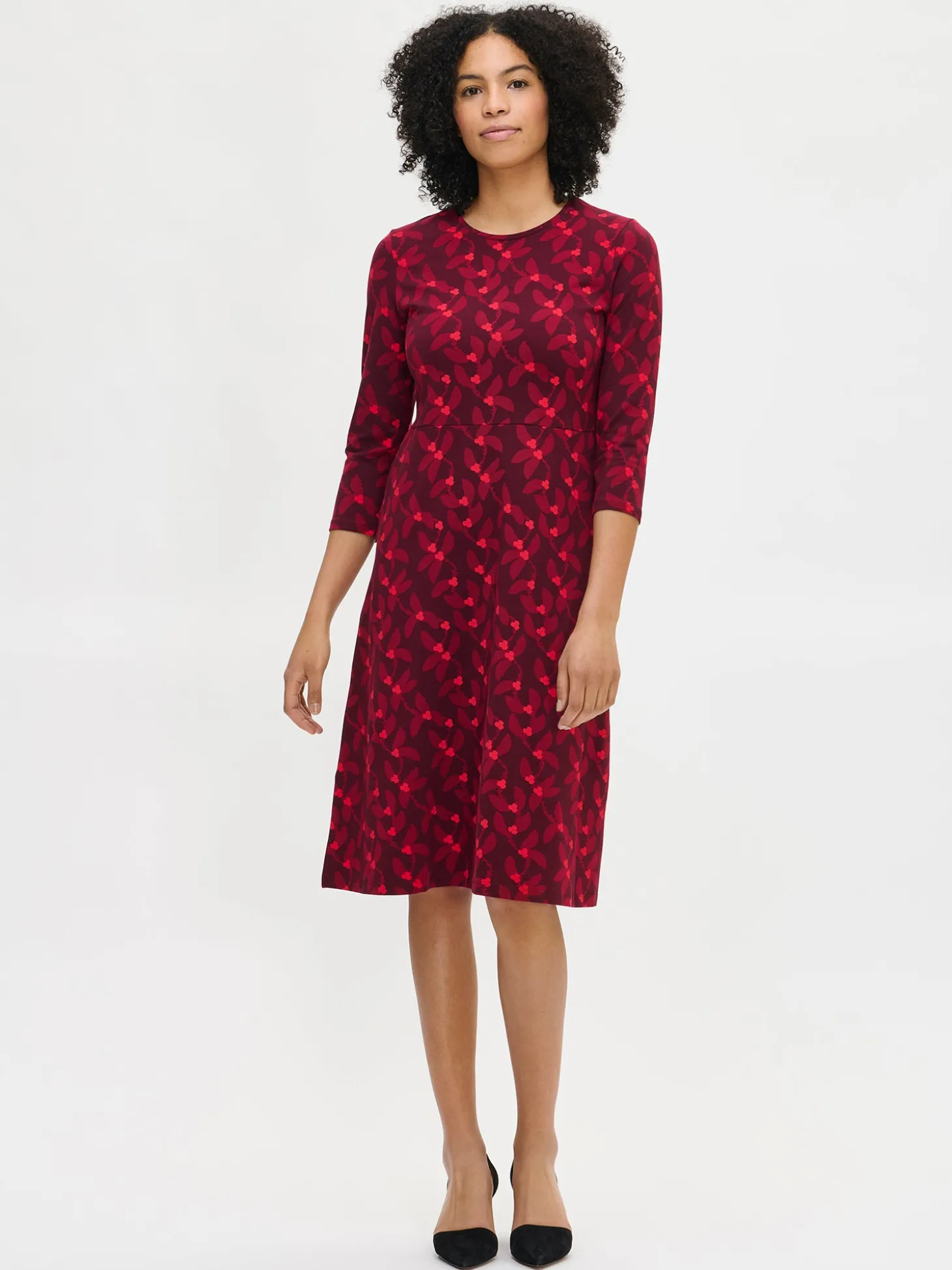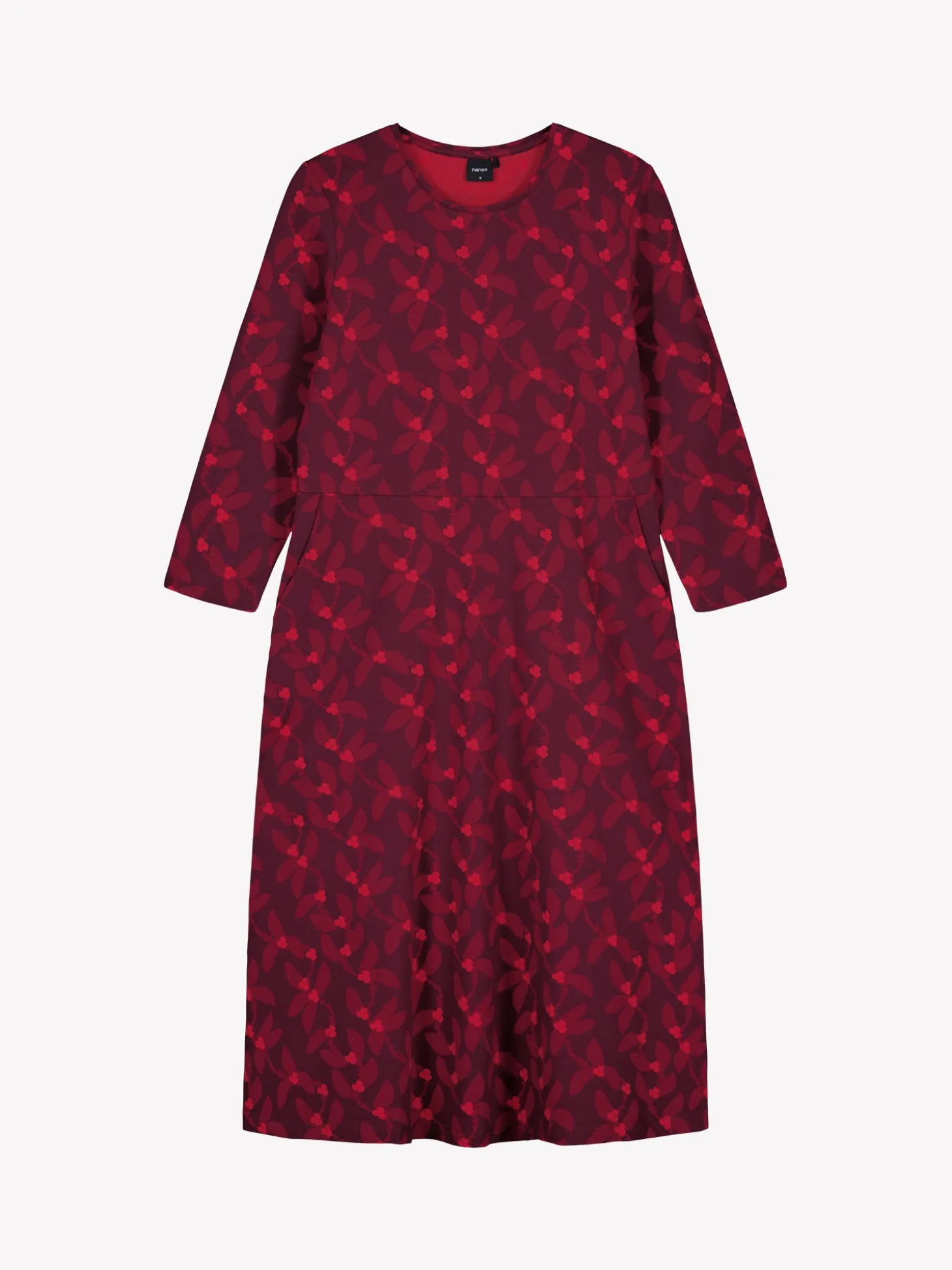 Naisten kuosillinen punainen Vieno-mekko. Mekossa on tereellä viimeistelty ovaali pääntie, sivuissa taskut ja 3/4 pituiset hihat. Mekon helma kellottuu kauniisti. Mekon pituus koossa M on noin 110 cm. Materiaali on miellyttävän tuntuista ja helppohoitoista puuvilla-elastaani-neulosta.