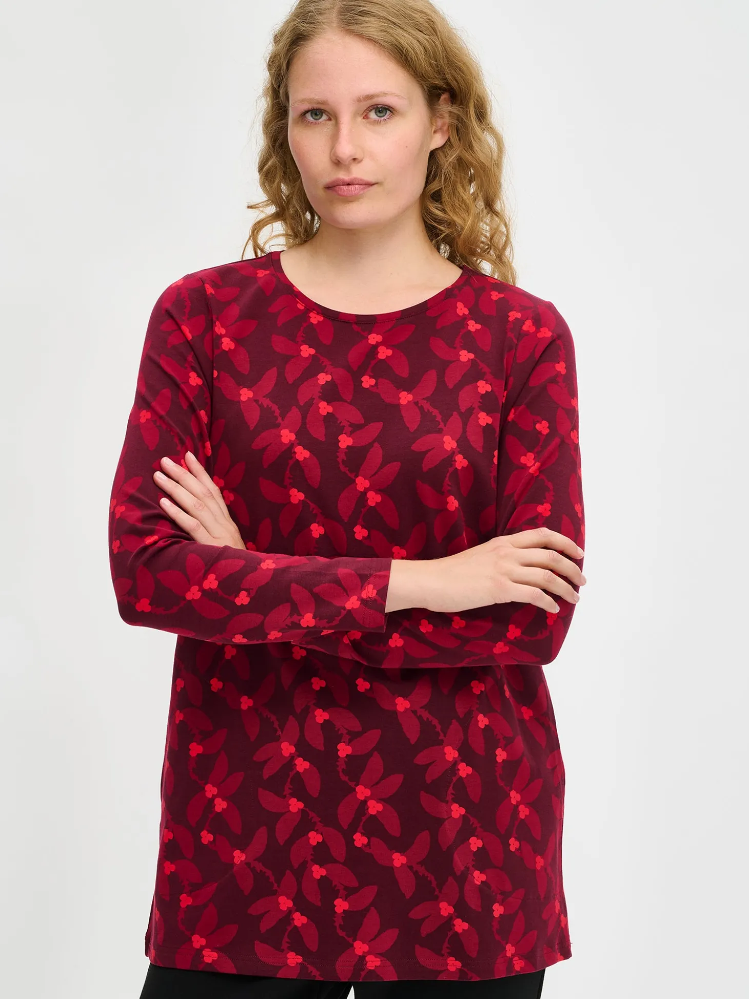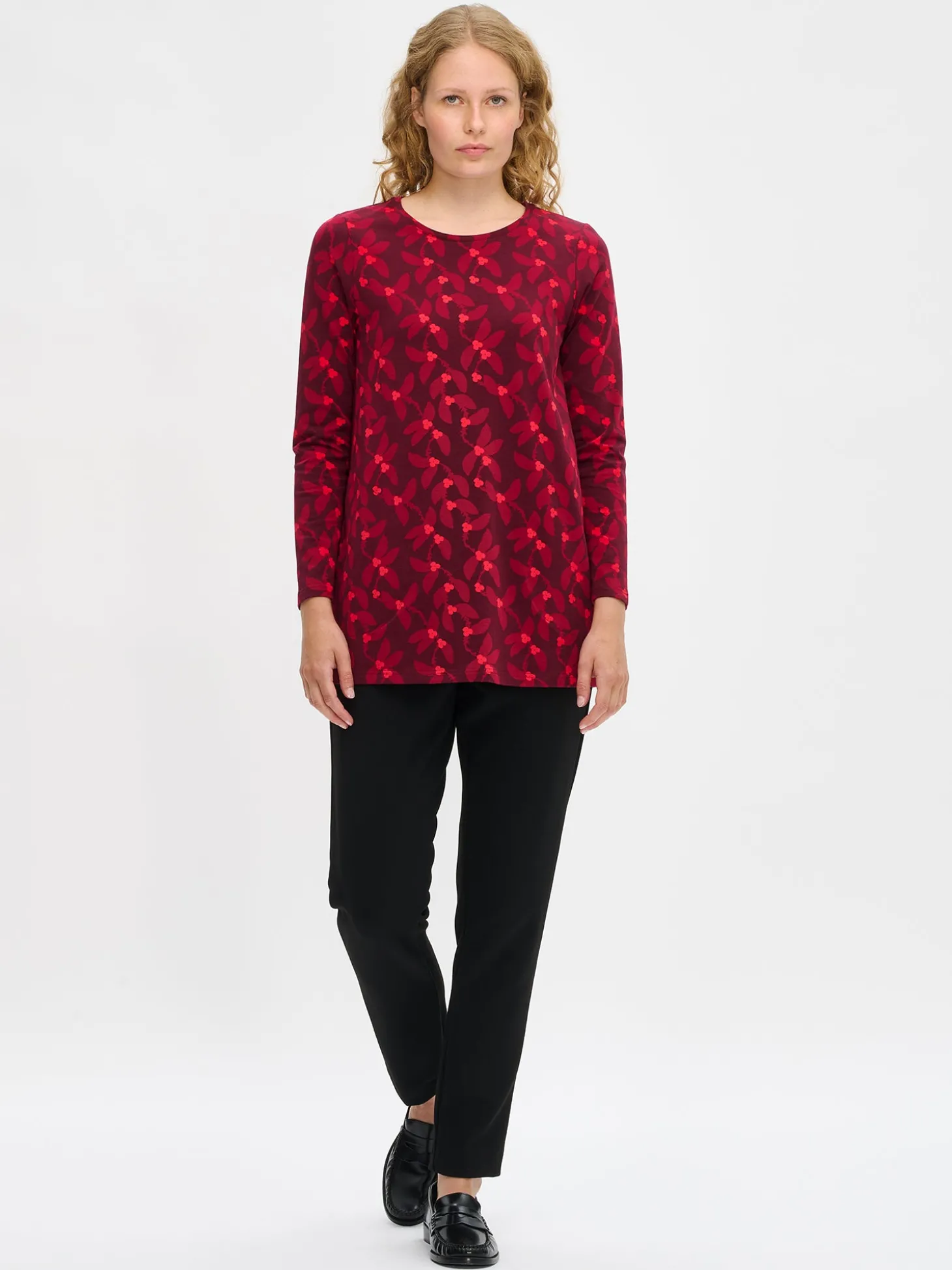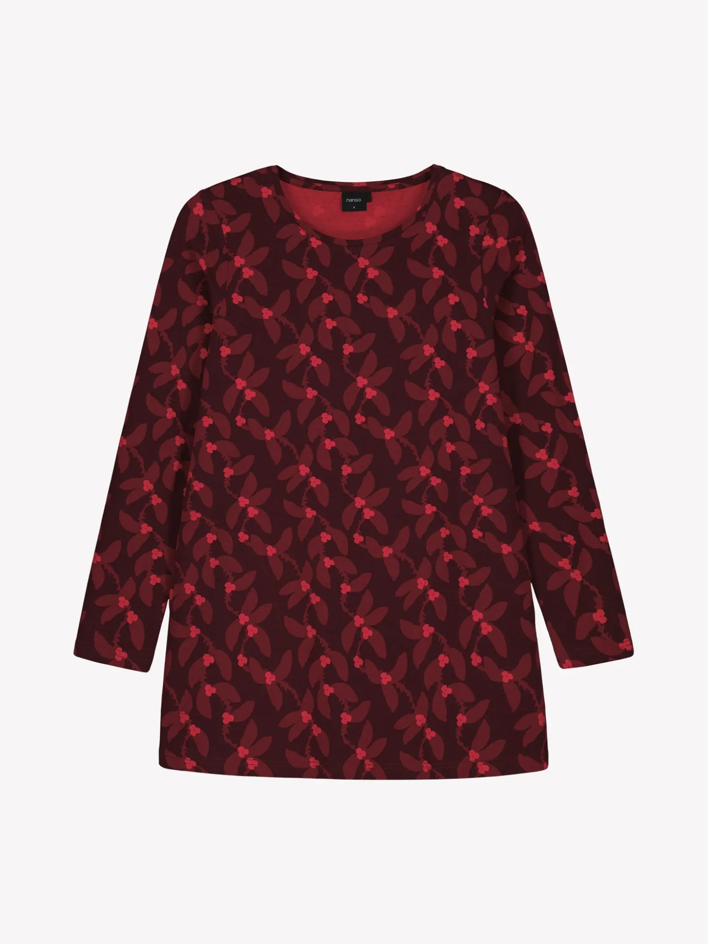 Naisten kuosillinen punainen Vieno-tunika. Tunikassa on pyöreä tereellä viimeistelty pääntie, sivuissa taskut ja täyspitkät hihat. Tunikan pituus koossa M on noin 80 cm. Materiaali on miellyttävän tuntuista ja helppohoitoista puuvilla-elastaani-neulosta.