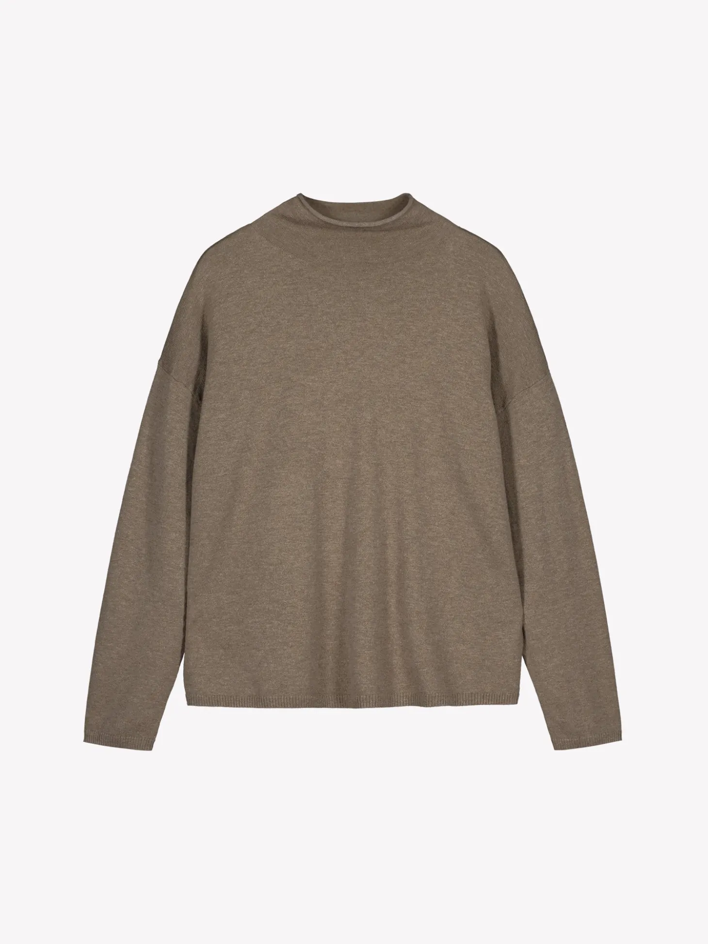 Naisten yksinkertaisen tyylikäs ja kevyt ruskeanharmaa pitkähihainen Villis-neulepusero. Yksivärisessä puserossa on leveä kilpikonnakaulus, pudotettu olkalinja ja täyspitkät hihat. Puseron helmassa ja hihansuissa on kapea resori. Puseron pituus koossa M on noin 62 cm. Materiaali on laadukasta merinovillan ja puuvillan sekoitetta. Tuotteen valmistuksessa on käytetty sertifioitua mulesing-vapaata merinovillaa. Tuote on helppo yhdistää osaksi rentoa mutta tyylikästä arkipukeutumista.
