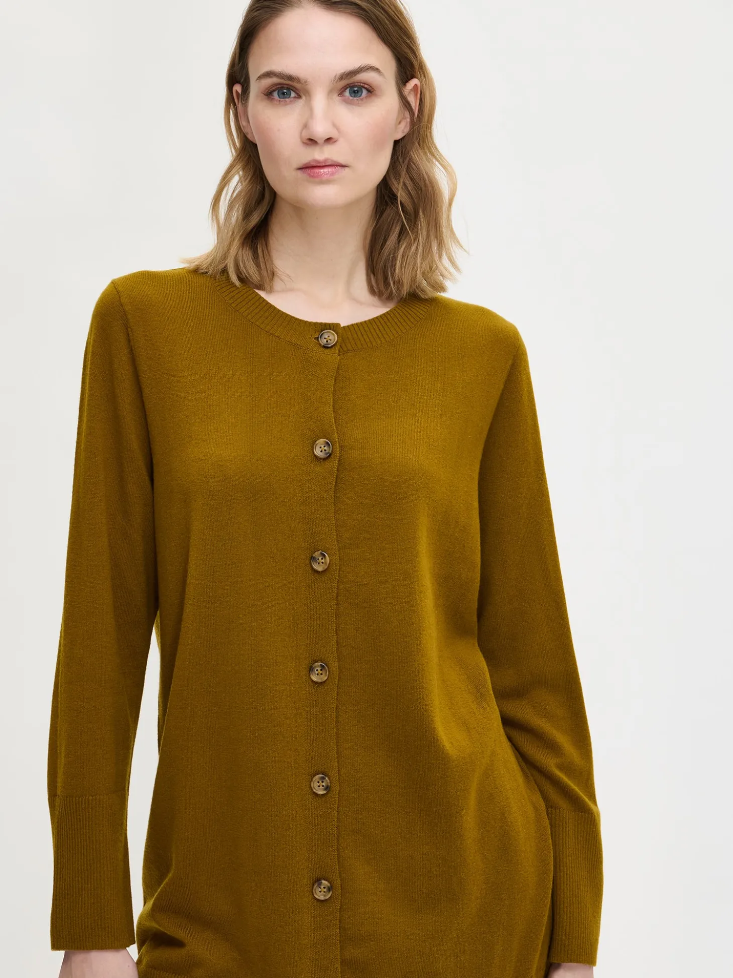 Naisten rento oliivinvihreä Villis-neuletakki. Kevyt mutta lämmin villatakki on ihana lisä syksyn pukeutumiseen. Neuletakissa on pyöreä resoripääntie ja napitus edessä. Neuleen hihat ovat täyspitkät ja helmassa sekä hihansuissa on leveä resori. Neuletuakin pituus koossa M on noin 85 cm. Mukava, neuletunika on neulottu laadukkaasta merinovillan ja puuvillan sekoitteesta. Tuote on vesipestävä eikä nyppyynny helposti. Tuotteen valmistuksessa on käytetty mulesing-vapaata merinovillaa. Neuleen hoito-ohjeet löydät