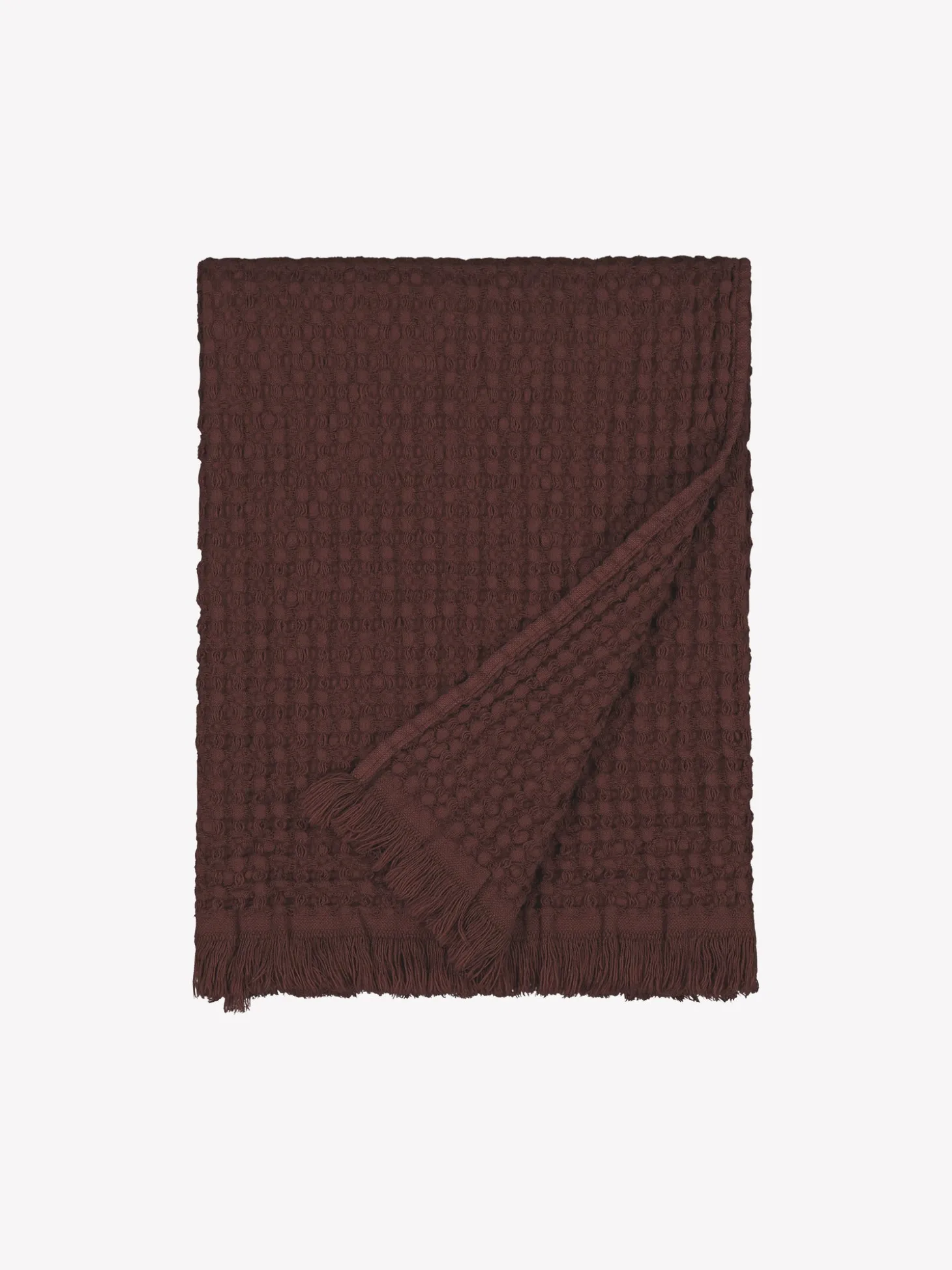 Nanson laadukas tummanruskea Vohveli-kylpypyyhe. Vohveli-pyyhkeessä yhdistyvät nostalgisen vohvelikankaan hyvät ominaisuudet ja moderni ulkonäkö. Vohvelikangas imee hyvin kosteutta ja kuivuu nopeasti keveytensä ansiosta. Pyyhe menee pieneen tilaan ja on helppo pakata rannalle tai salille mukaan. Laadukas pyyhe tuntuu miellyttävältä iholla ja hoito-ohjeita noudattamalla se pysyy pitkään upeana. Kangas on värjätty Öko-Tex 100 -standardin mukaisilla värjäysaineilla. Kylpypyyhkeen koko on 70 cm x 140 cm ja ripustuslenkki on pitkällä sivulla. Pyyhkeen reunassa on koristeelliset hapsut.