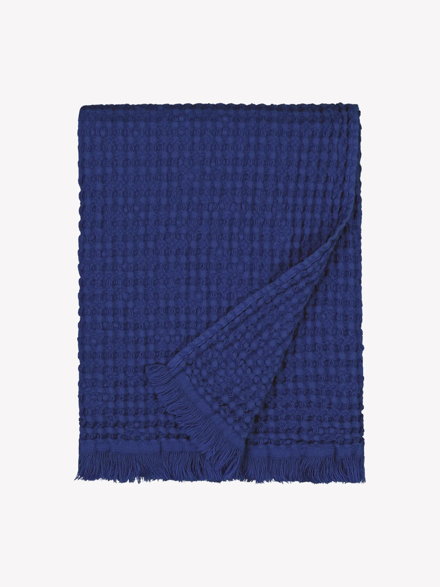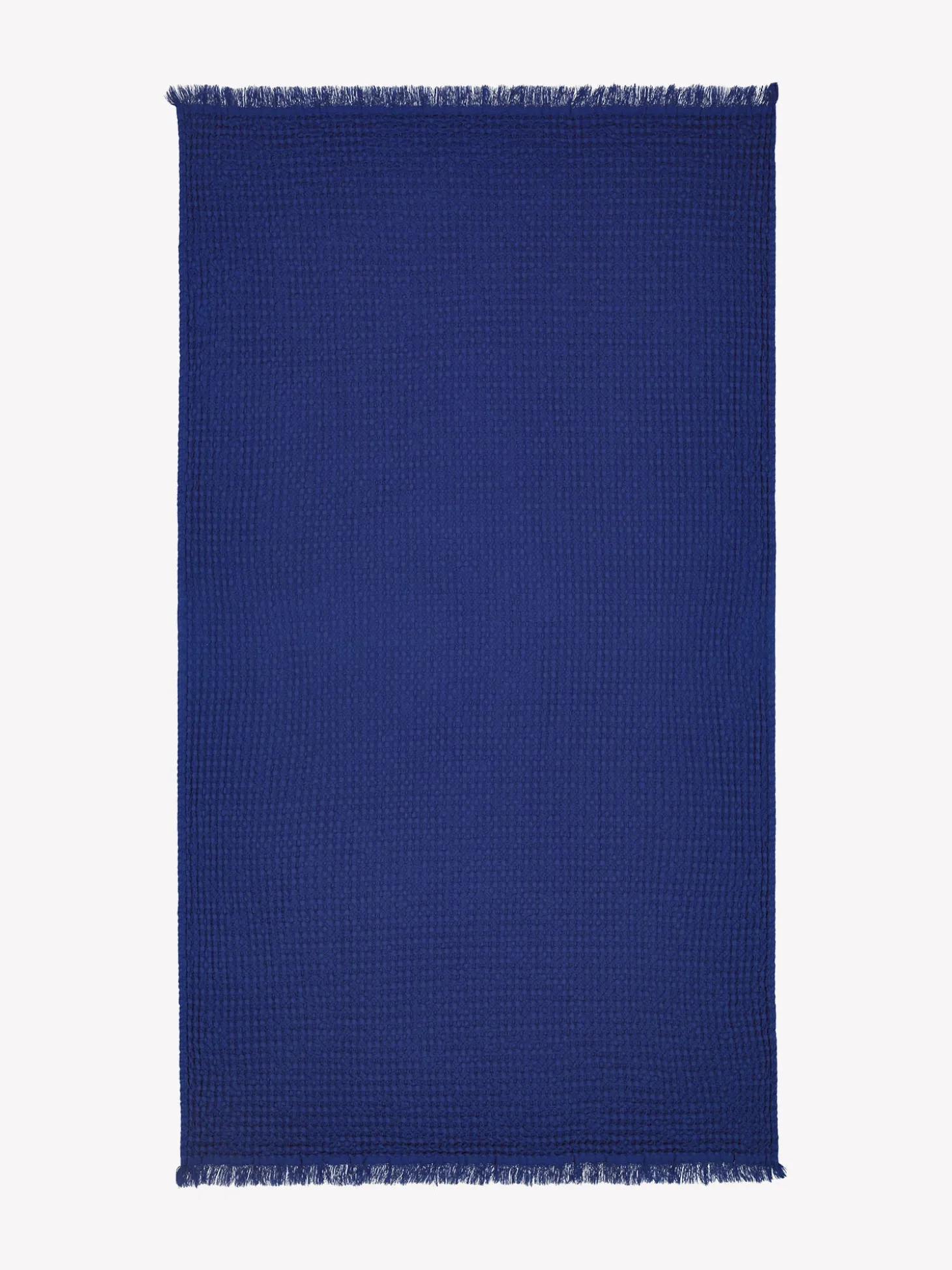 Nanson laadukas tummansininen Vohveli-kylpypyyhe. Vohveli-pyyhkeessä yhdistyvät nostalgisen vohvelikankaan hyvät ominaisuudet ja moderni ulkonäkö. Vohvelikangas imee hyvin kosteutta ja kuivuu nopeasti keveytensä ansiosta. Pyyhe menee pieneen tilaan ja on helppo pakata rannalle tai salille mukaan. Laadukas pyyhe tuntuu miellyttävältä iholla ja hoito-ohjeita noudattamalla se pysyy pitkään upeana. Kangas on värjätty Öko-Tex 100 -standardin mukaisilla värjäysaineilla. Kylpypyyhkeen koko on 70 cm x 140 cm ja ripustuslenkki on pitkällä sivulla. Pyyhkeen reunassa on koristeelliset hapsut.