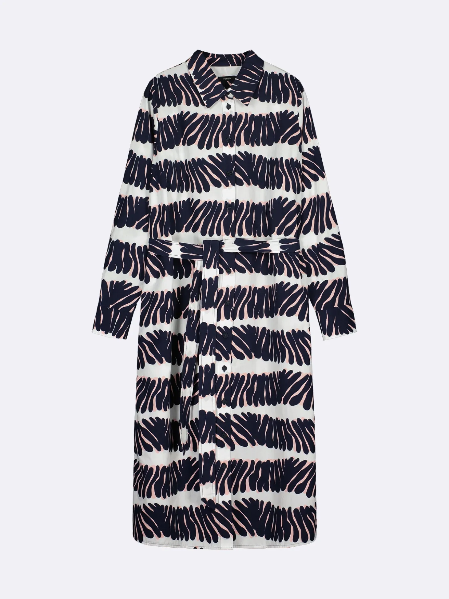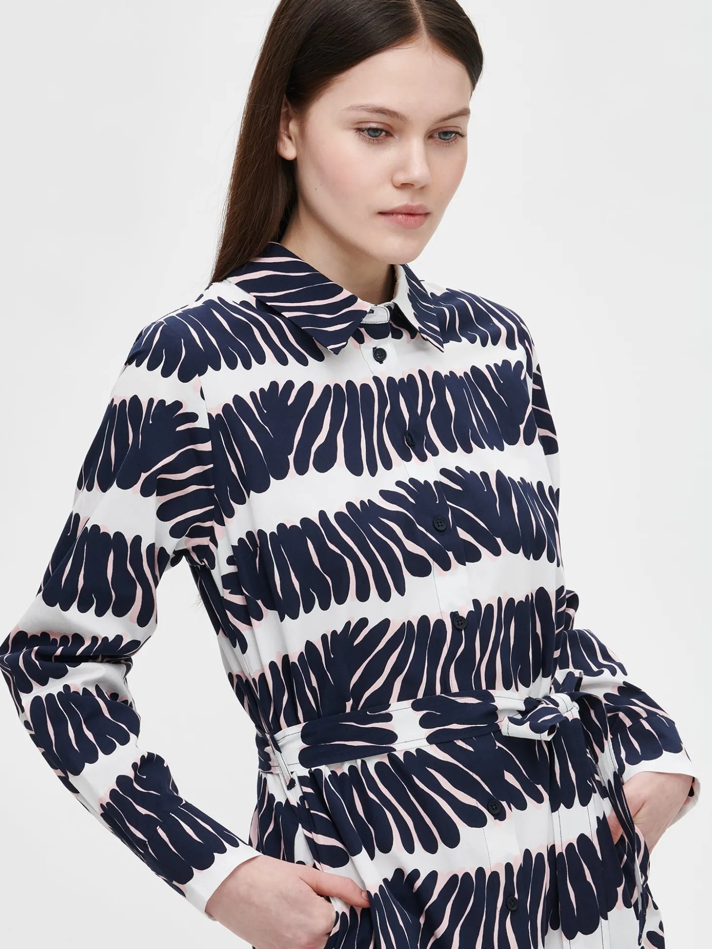 Naisten kuosillinen tummansininen Vuono-mekko. Tyylikäs paitamekko on täydellinen arkeen. Mekossa on edessä napitus, rintamuotolaskokset, klassinen paitapuserokaulus ja takana laskos. Mekossa on täyspitkät hihat, joiden hihansuissa on nappikalvosimet. Vyötäröllä on irroitettava vyö. Mekon helma on pyöristetty ja sivuissa on halkiot. Mekon pituus koossa 38 on noin 120 cm. Materiaali on kevyttä, mutta ryhdikästä puuvilla-popliinia.